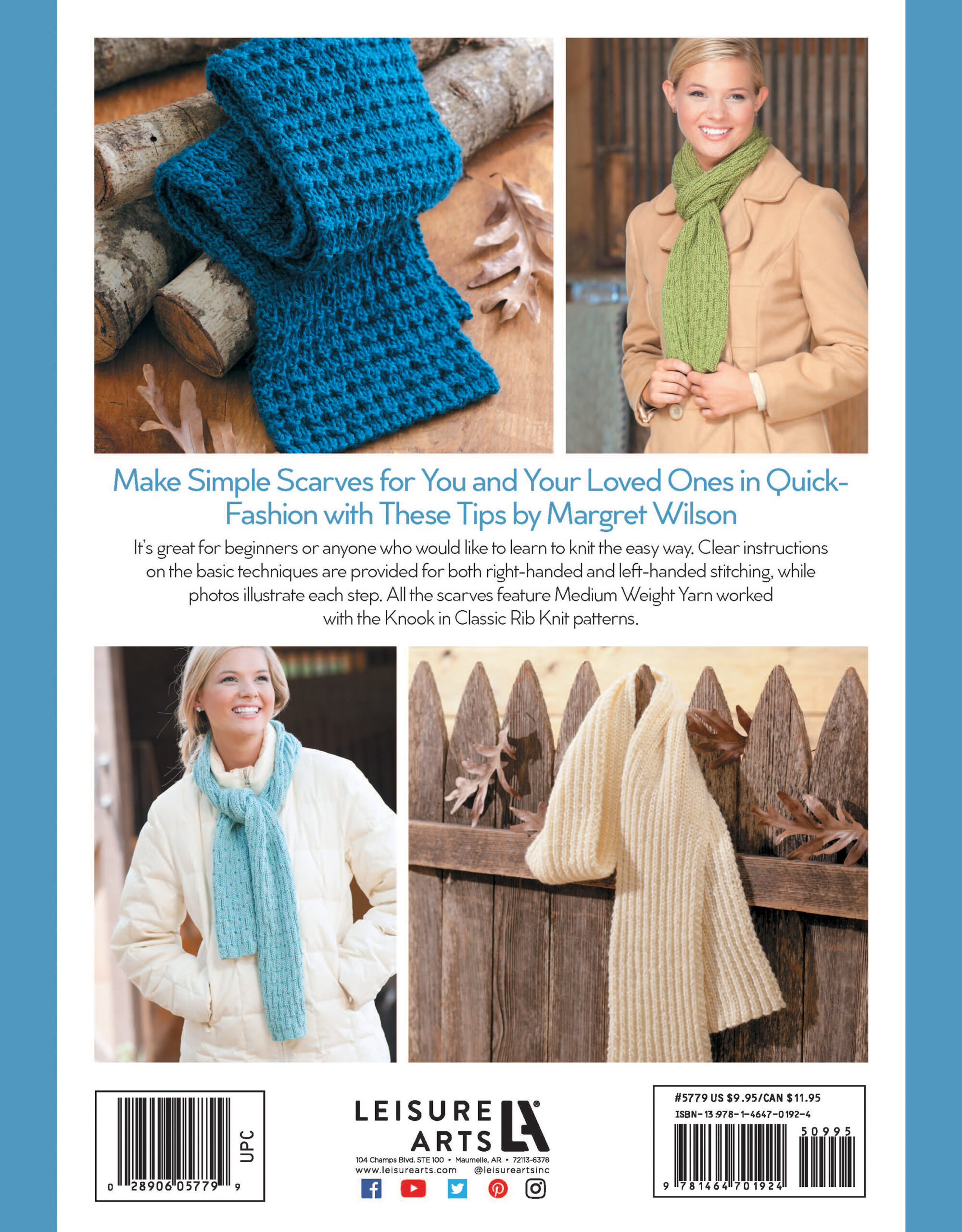 $9.95Simple Scarves Made With The Knook Knit- With the Knook, you can now knit with a crochet hook. The Knook is a specialized crochet hook that creates true knitted fabric, while the attached cord completely prevents dropped stitches. Create 9 ribbed scarf designs perfect for any weather or season. Designs include: 2x2 ribbed scarf, beaded rib scarf, mistake rib scarf, textured rib scarf, waffle stitch scarf and more. Projects call for size 4 worsted weight yarn and a US crochet hook size H-8, 5 millimeter, Knook. Includes step-by-step instructions for each design and a general guide to Knooking. Finished scarves measure between approximately 5"x 51" and 6 1/2"x 59". Beginner skill level. Knook LEA46820 Beginner Set, tools, and introductory LEA5776 Learn To Knook Knit, sold separately. 36 pages in a soft cover.
