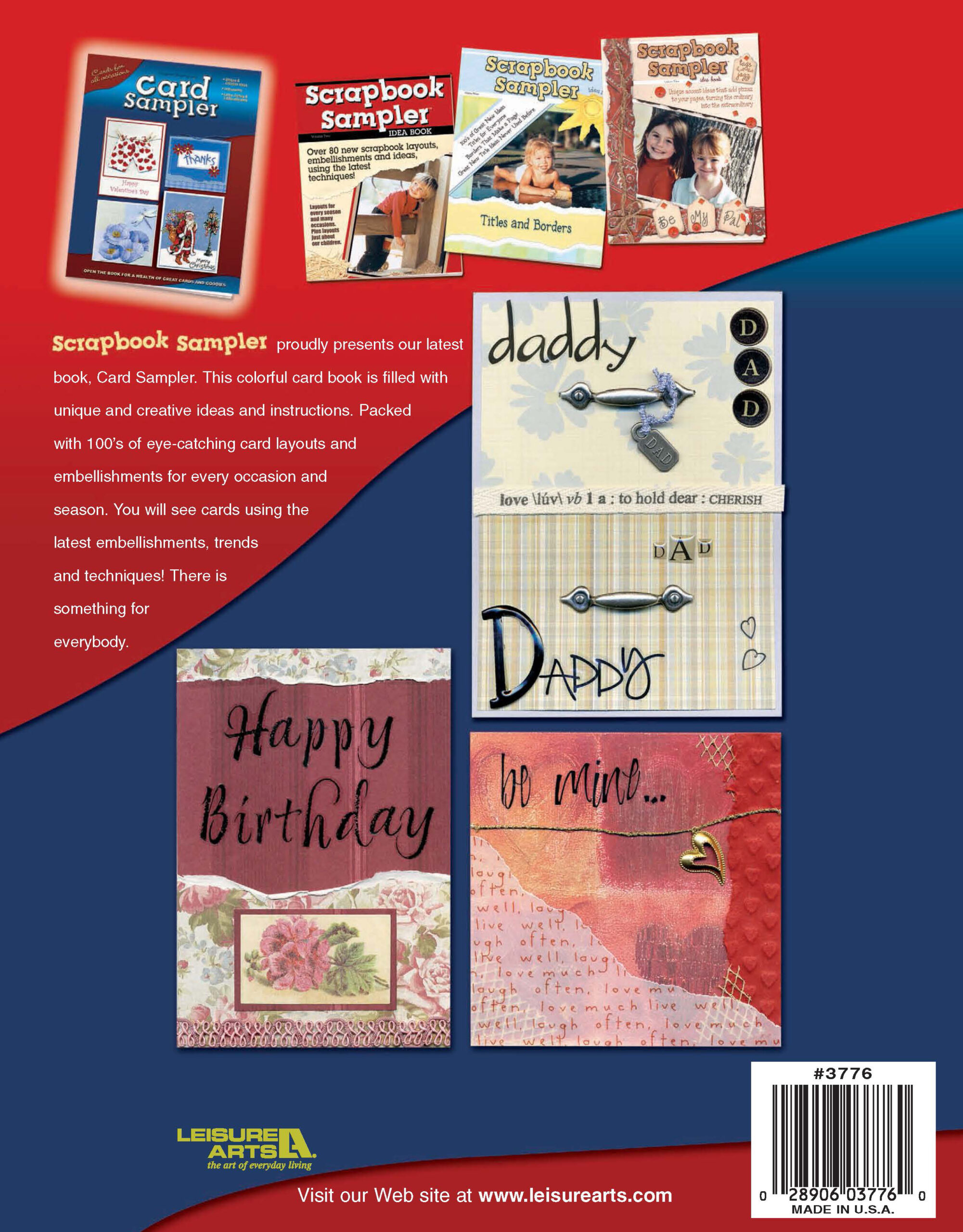 Leisure Arts Card Sampler Cards For All Occasions eBook- This inspirational card design sampler will help you create cards for every occasion. Includes designs for birthdays, thank yous, love, weddings, baby showers, well wishes, seasons, holidays and more. Each card can be made through a combination of scrapbooking and rubber stamping. Includes step-by-step instructions and supply lists for each design. 40 pages, PDF download.