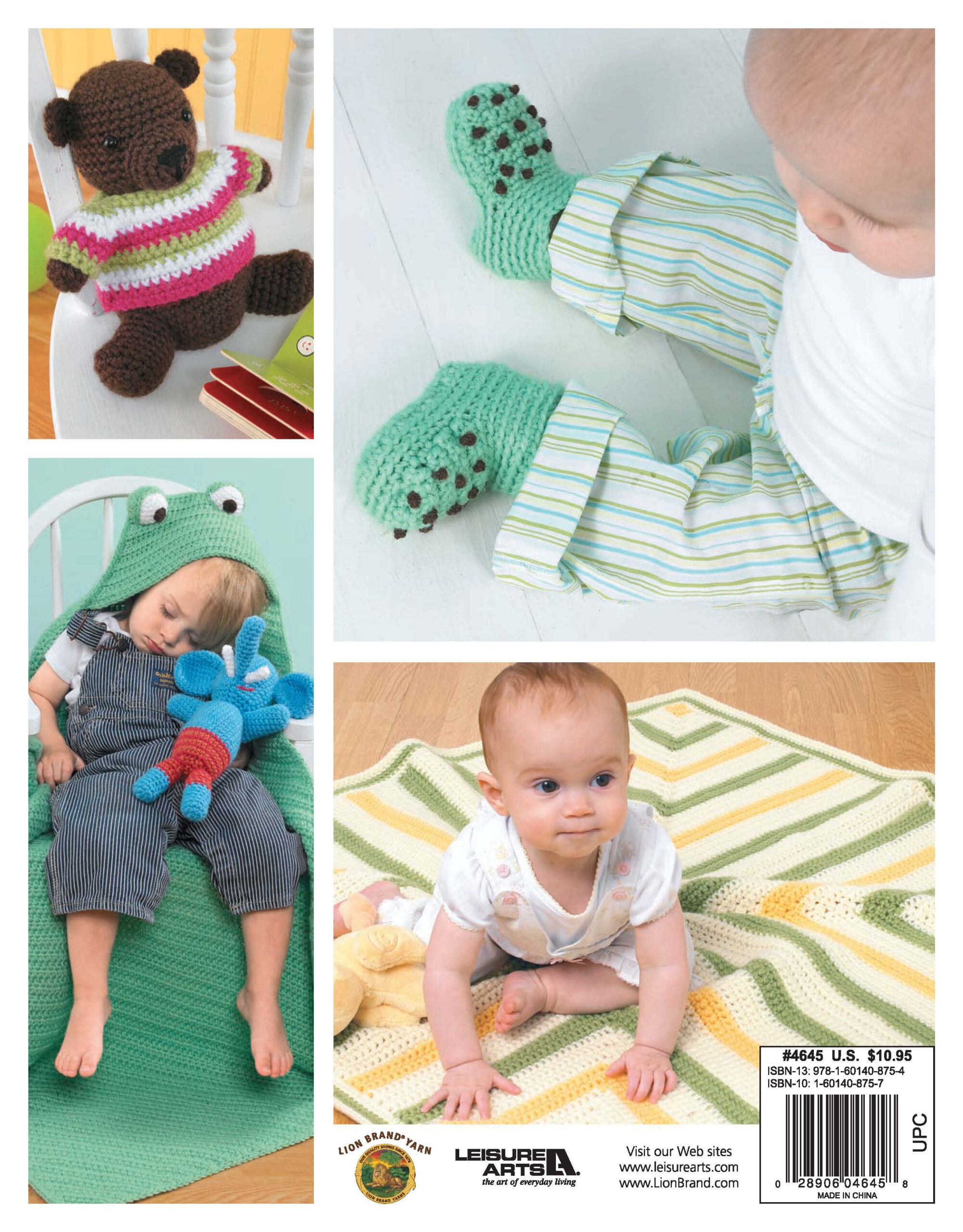 Leisure Arts Giggles & Grins Crochet eBook- 12 cute crochet designs for your favorite tot. Projects feature a colorful selection of Lion Brand Vanna's Choice Baby yarn. Designs include: a-b-c baby block, amigurumi elephant, granny square blankie, froggy hooded baby blanket, mint chip baby booties and more. Projects call for size 4 worsted weight yarn and crochet hooks ranging between US size G-6, 4.25mm, and J-10, 6mm. Includes step-by-step instructions for each design, and a general guide to crochet stitches. Cardigan designs include sizing options for infants between 6 and 18 months. Easy skill level. 46 pages, PDF download.