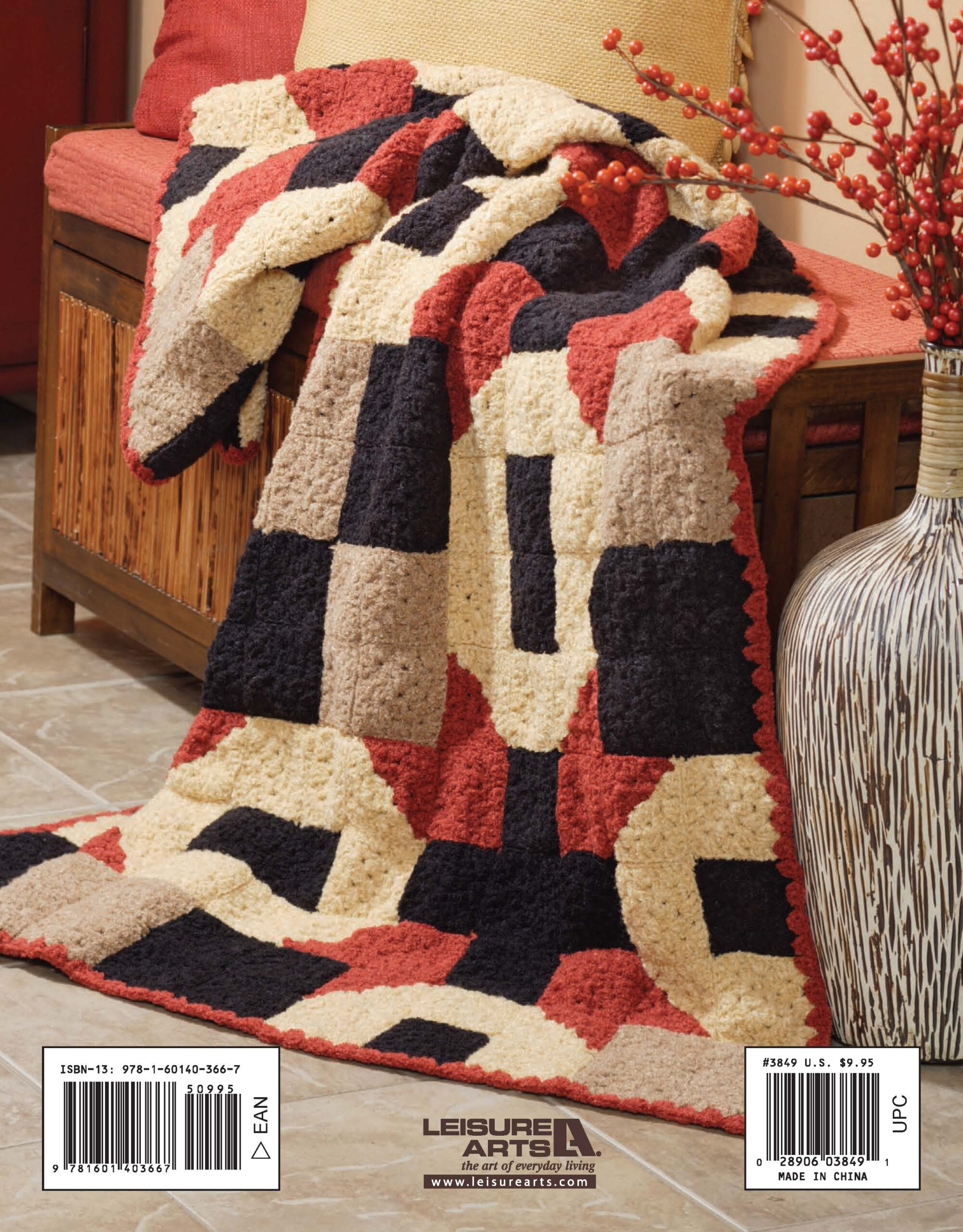 $9.95Crochet Mosaic Art Afghans- 5 crocheted afghans made of graphic granny squares make a dramatic break from tradition. Designs include painted eggs, puzzled, belt buckles, greys on pink, and five C's. All are easy skill level, use size 4 medium weight yarn, and a crochet hook in a US size G-6. Charted variations of the designs are called echoes, English garden, barrel of monkeys, flower power, southwest, and zigzag. Includes a blank grid for charting additional variations, step-by-step instructions for each pattern and full color photos of additional color variations. 36 pages in a softcover.