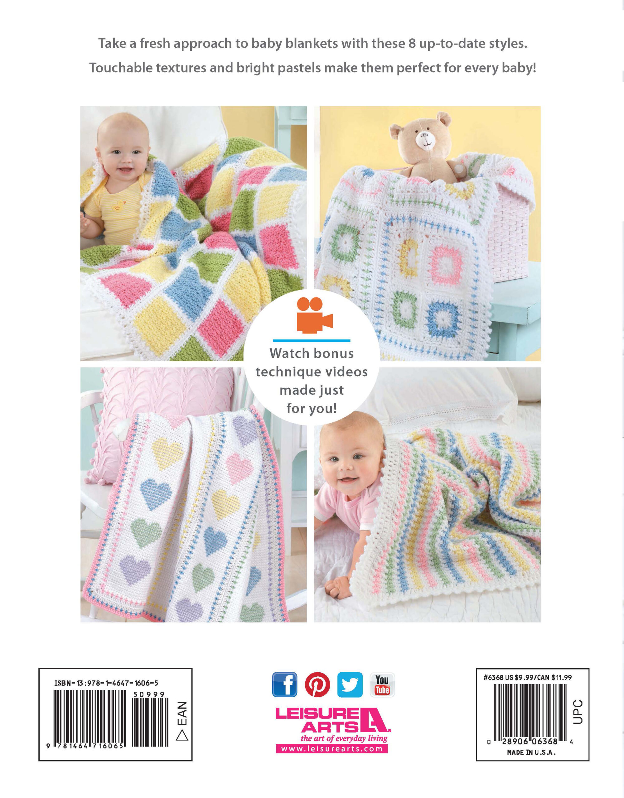 $9.99Blankets For Every Baby Crochet- Sweet gifts for a new arrival, these 8 designs have the timeless appeal of classic baby blanket styles plus a fresh feel with updated colors and special details. Mom will love the bright pastels, and baby will enjoy touching the 3-D flowers and all the nubby stitch patterns. Designs include: confetti stripes, color blocks, baby bouquet, and more. Projects call for suize 4 worsted weight yarn and crochet hooks in US sizes ranging between H-8 and K-10 1/2. INcludes stp-by-step instructions for each design, colorwork and placement charts, and stitch guides for the more complex stitches. Finished blankets measure between approximately 34 1/2"x 41" and 38 1/25"x 45 1/4". Easy skill level. 32 pages, softcover.
