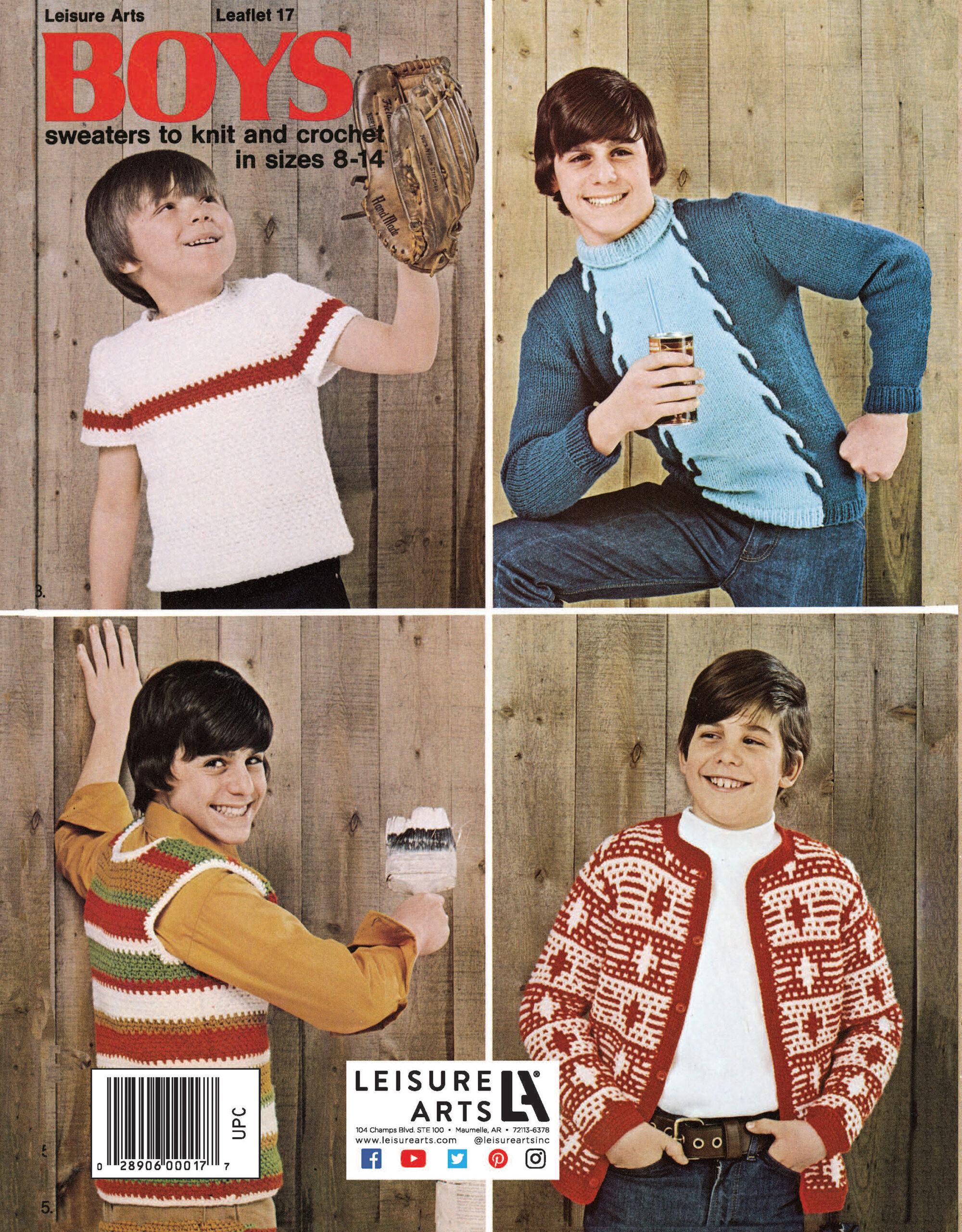 $7.99Leisure Arts Boys Sweaters To Knit And Crochet eBook- Create the perfect cozy sweaters for gradeschool boys with this original leaflet from Leisure Arts. This vintage pattern book includes knitted warm-up pullover, knitted here's the pitch pullover, crocheted home run tee shirt, knitted double header pullover, crocheted high fly vest, and knitted time out cardigan. Projects call for size 2 sport and 4 worsted weight yarns, US size 4, 6, 7, 10, and 11, straight knitting needles, and US size G-6 and J-10 crochet hooks. Includes row-by-row instructions for each panel of each projects, with sizing options for US boys sizes 8-14. Originally published as Leisure Arts Leaflet 17, Boys Sweaters To Knit And Crochet. 4 pages, PDF download.