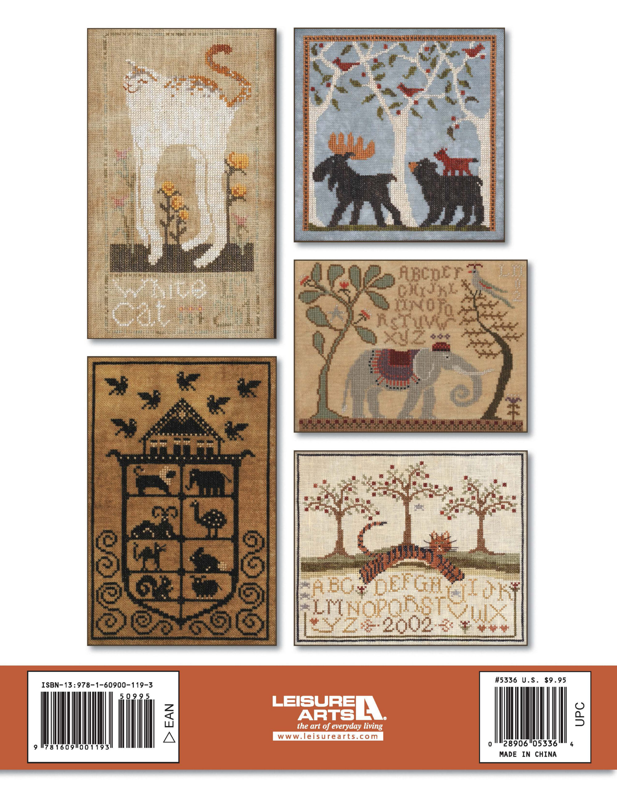 All Creatures Stitched & Small- What charming creatures these are. Learn to stitch a stretching cat, a band of woodland friends, or a fun silhouette of Noah's Arc. Let a tiger leap through the forest while an elephant trumpets nearby, and, of course, the dogs will want to go for a run. By the end of this, you'll have your own counted cross stitch menagerie. Sample designs were stitched on a variety of 32, 35, 36 and 40 count fabrics before being custom framed. Stitch counts measure between approximately 99w x 99h and 123w x 102h. 24 pages, softcover.