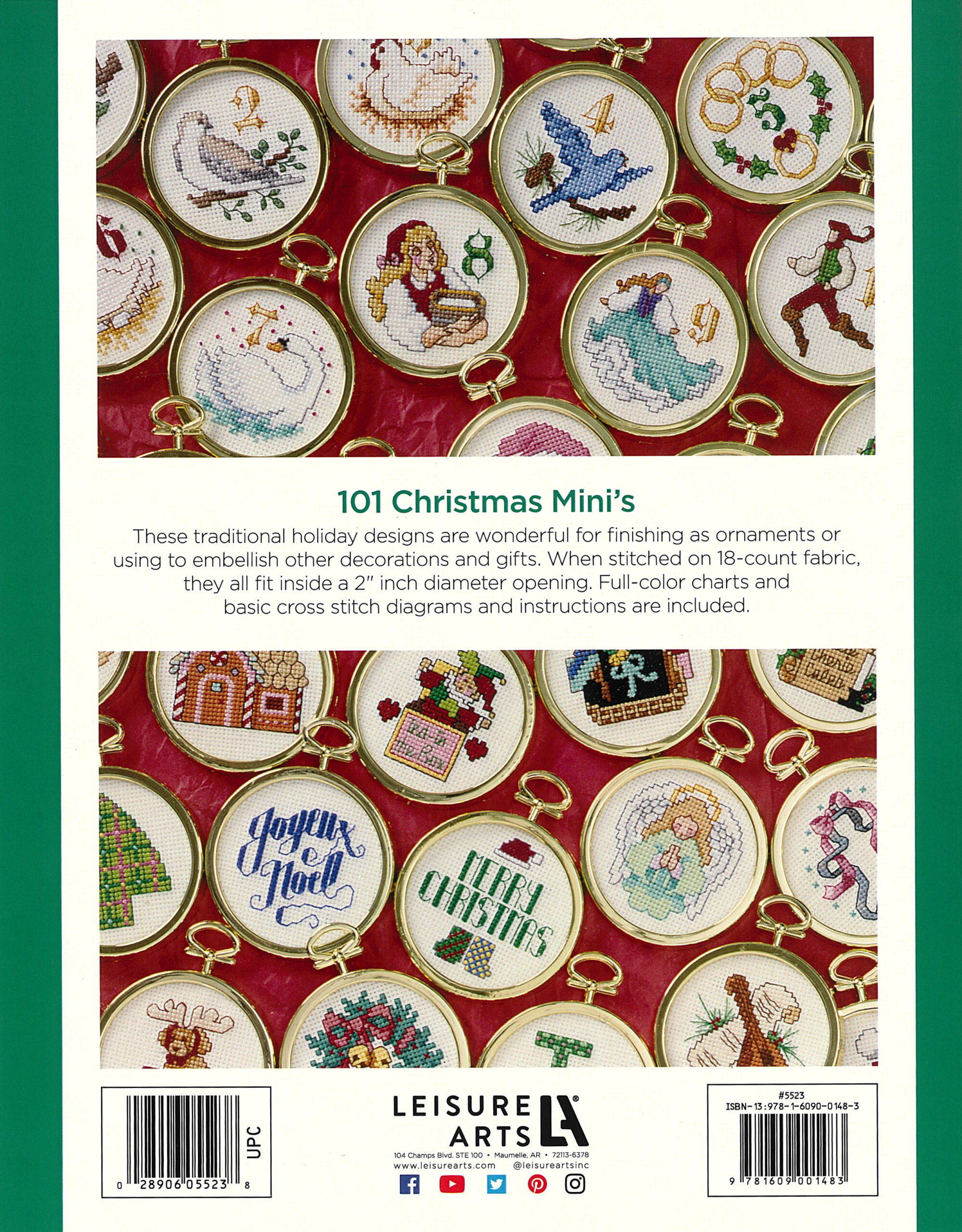 101 Christmas Minis 2- These traditional holiday designs are wonderful for finishing as ornaments or using to embellish other decorations and gifts. Designs feature Nativity scenes, Santas, snowmen, florals, toys, elves, stars, candles, greetings, pets, music, and more. Full-color charts with DMC color recommendations, cross stitch diagrams and instructions are included. Finished design sizes vary but all fit inside a 2 1/2" square frame or round ornament when stitched on 18 count Aida. Intermediate experience level. 24 pages in a softcover.
