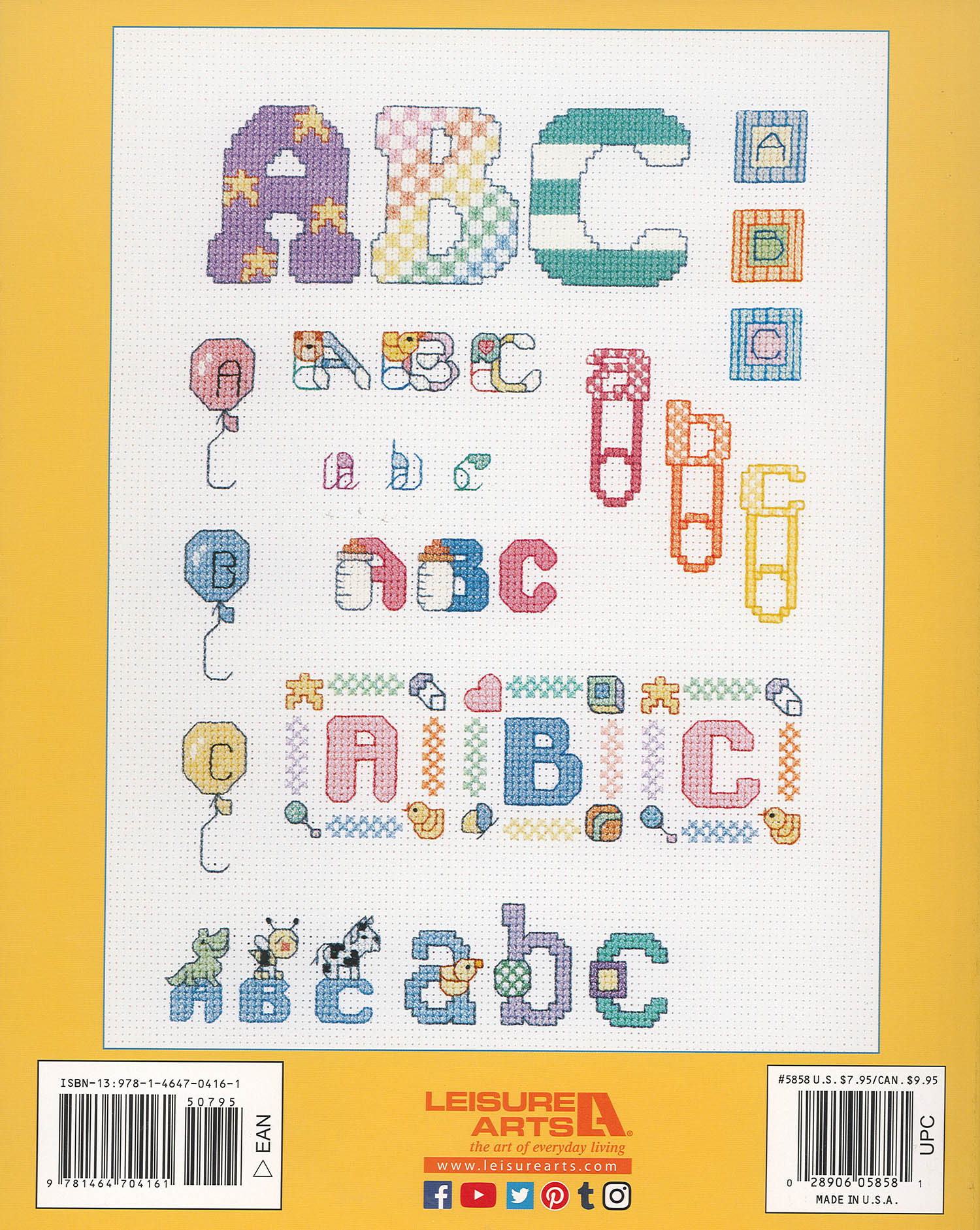 Alphabets For Baby Cross Stitch- Make sure they'll always know their ABC's. These wonderful counted cross stitch designs are perfect for personalizing items for the newest little one in your life. There are 15 different alphabets to choose from and each one includes color listings for Anchor and DMC floss. Designs include: flowers, pets, diaper pins, and more. 20 pages, soft cover.