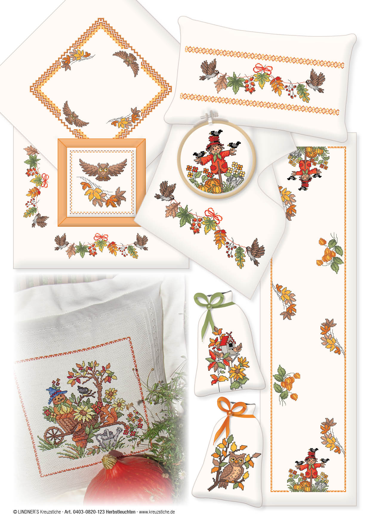 $7.99Lindner's Cross Stitch Charts feature classic embroidery themes and motifs reimagined by German designers Michael and Gudrun Lindner. All design charts are full-color counted cross stitch. Use these chart designs to add a decorative touch to curtains, table linens, kitchen towels, pillows and much more. Autumn Lights ePattern- Includes a range of beautiful fall motifs like: an owl on a bright leafy branch, a wheelbarrow with a scarecrow and leaves in it, a watering can, natural leafy floral motifs, geometric patterns and much more. Large border designs include flying owls with geometric patterns, and a collection of sunflowers. Largest motif measures approximately 51 x 251 stitches. Includes a page with embroidery tips and tricks, illustrated stitch guides, color recommendations and general instructions in several languages. 5 pages, PDF download.