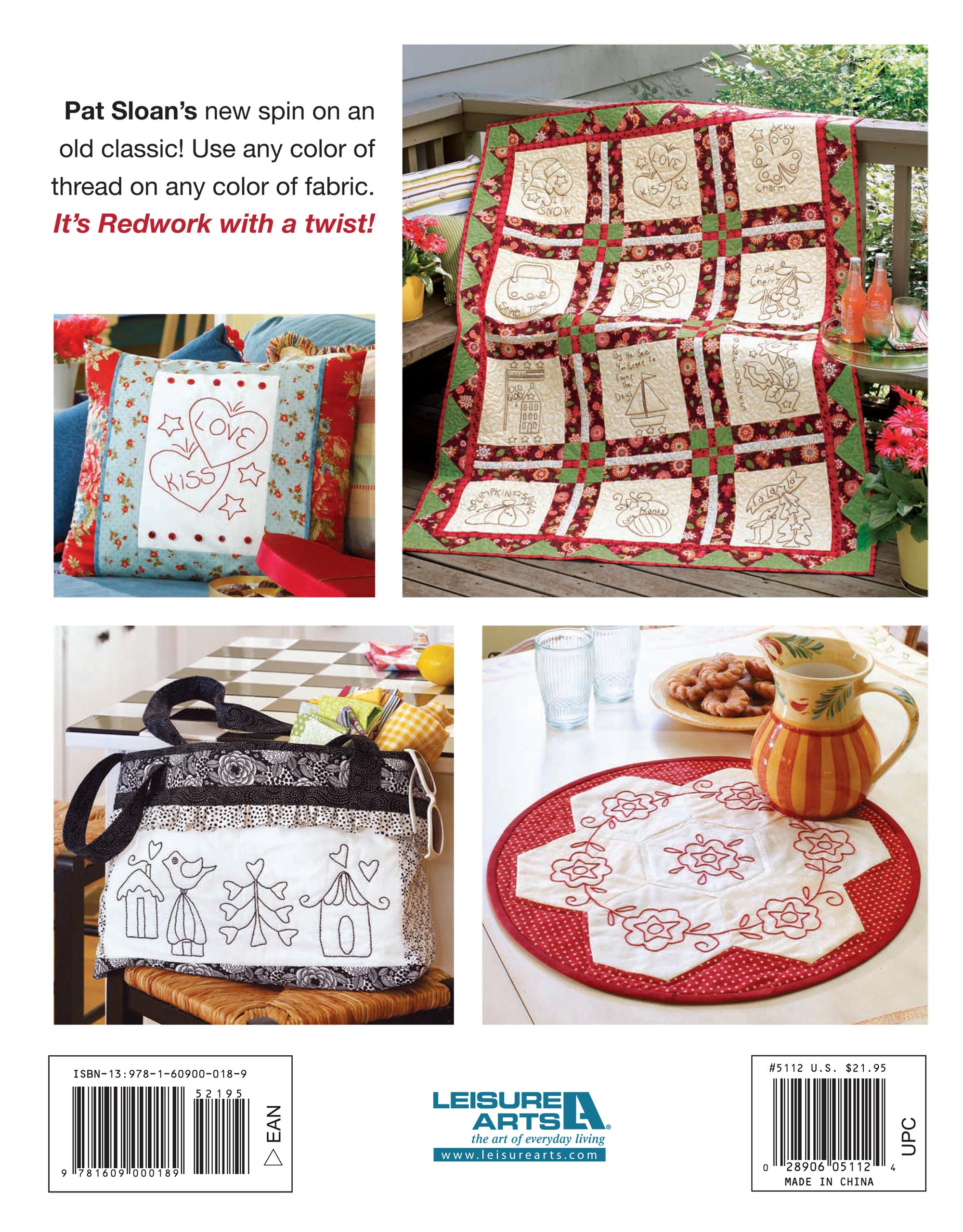 Leisure Arts Redwork With a Twist Quilt eBook- Create beautiful hand embroidered quilts inspired by the historical embroidery of the late 1800s where Turkey Red thread was popular. These updated designs combine modern quilting techniques with panels of redwork embroidery. Projects include around the town, around the town tote, liberty blue, a year in stitches, a year in stitches pillow & sleeves, notions keeper, threadcatcher, pincushion and hexagon table topper. Includes step-by-step instructions, embroidery and quilting guides, and templates for redwork designs. Finished quilt sizes measure approximately 10"x 10" and 49"x 64". 90 page PDF download.