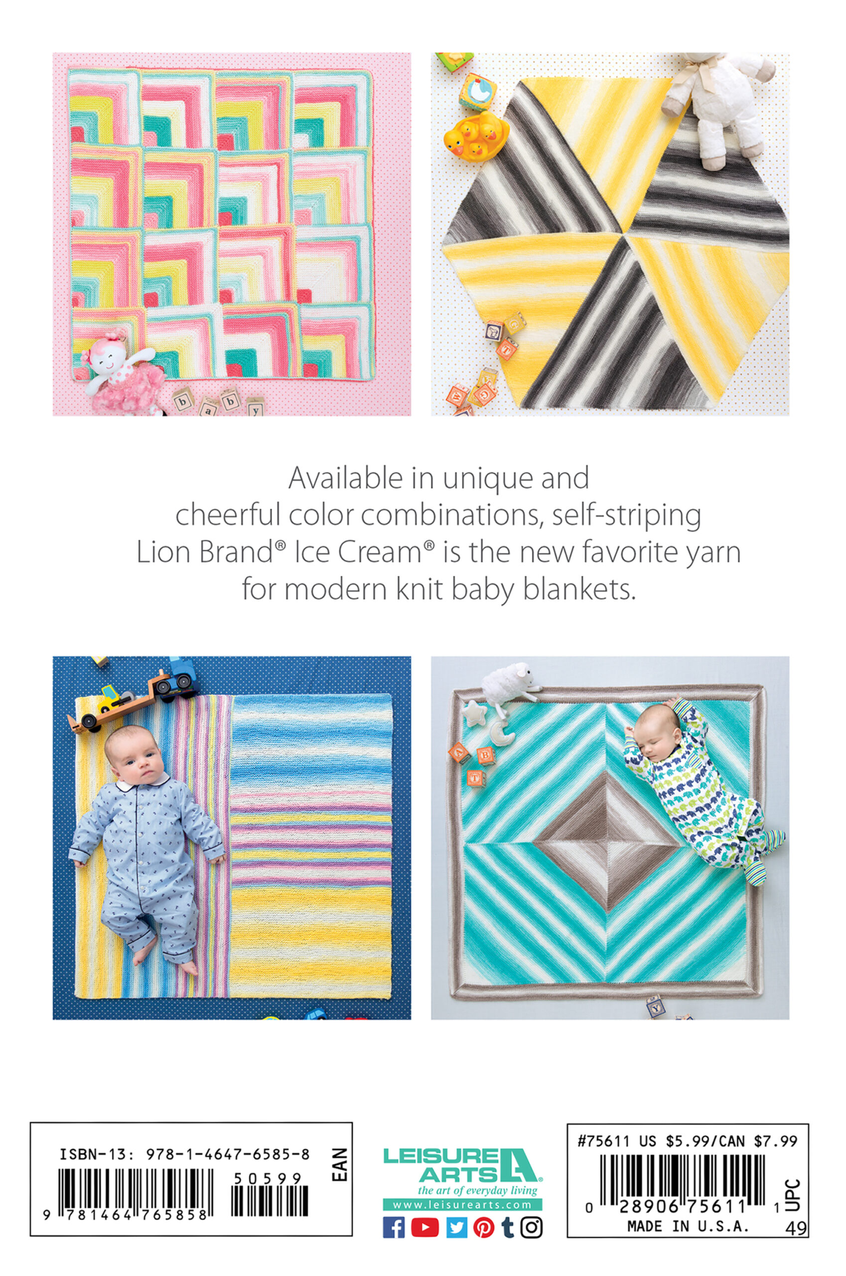Ice Cream Baby Afghans Knit- Knit nine modern baby blankets using Lion Brand Ice Cream light weight yarn. Ice Cream is a soft and easy-care yarn that works up to create delightful, self-striping colorways that blend unique and cheerful color combinations. The 100 percent acrylic yarn may be machine washed and dried. For beginner to easy-plus skill levels. Designs include: log cabin, four square, triangle squared, hexagon, mitered squares, right angles, simple diagonal, round ruffles, and happy valley. 48 pages in a softcover.