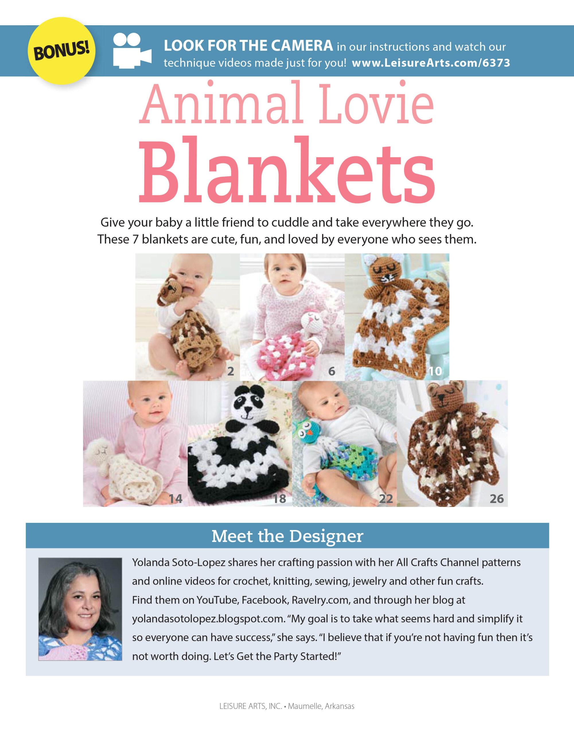 Animal Lovie Blanketss- Give your baby a little friend to cuddle and take everywhere they go. These quick and easy crochet designs make adorable baby gifts. Cute, fun, and loved by everyone who sees them, each blanket is a simple granny square with the toy attached at the center. Yolanda Soto-Lopez designs include: kitty, lamb, panda, and more. Beginner skill level with general crochet instructions and diagrams. All designs require US size 4 medium weight yarn and one each of size F-5, 3 3/4 millimeter, and J-10, 6 millimeter, hooks. Finished size measures approximately 13 1/2″ tall. 32 pages, soft cover.