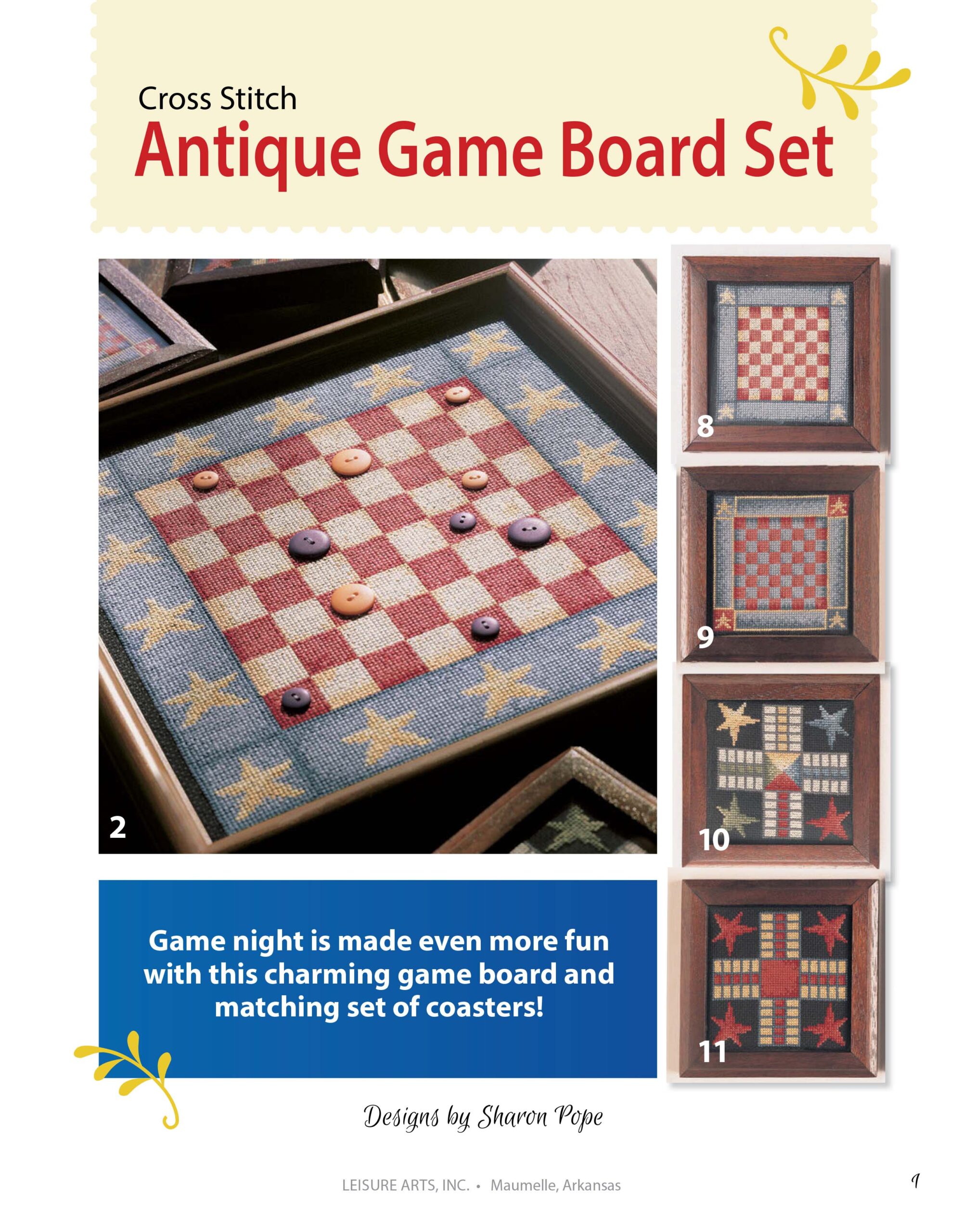 Antique Game Board Set Cross Stitch- Game lovers will enjoy using this unique gameboard with coordinating coasters. The designs were inspired by authentic antique game boards and stitched in slightly faded hues for a genuine timeworn look. You can basically make your own heirloom set. Herrschners counted cross stitch designs. 12 pages, soft cover.