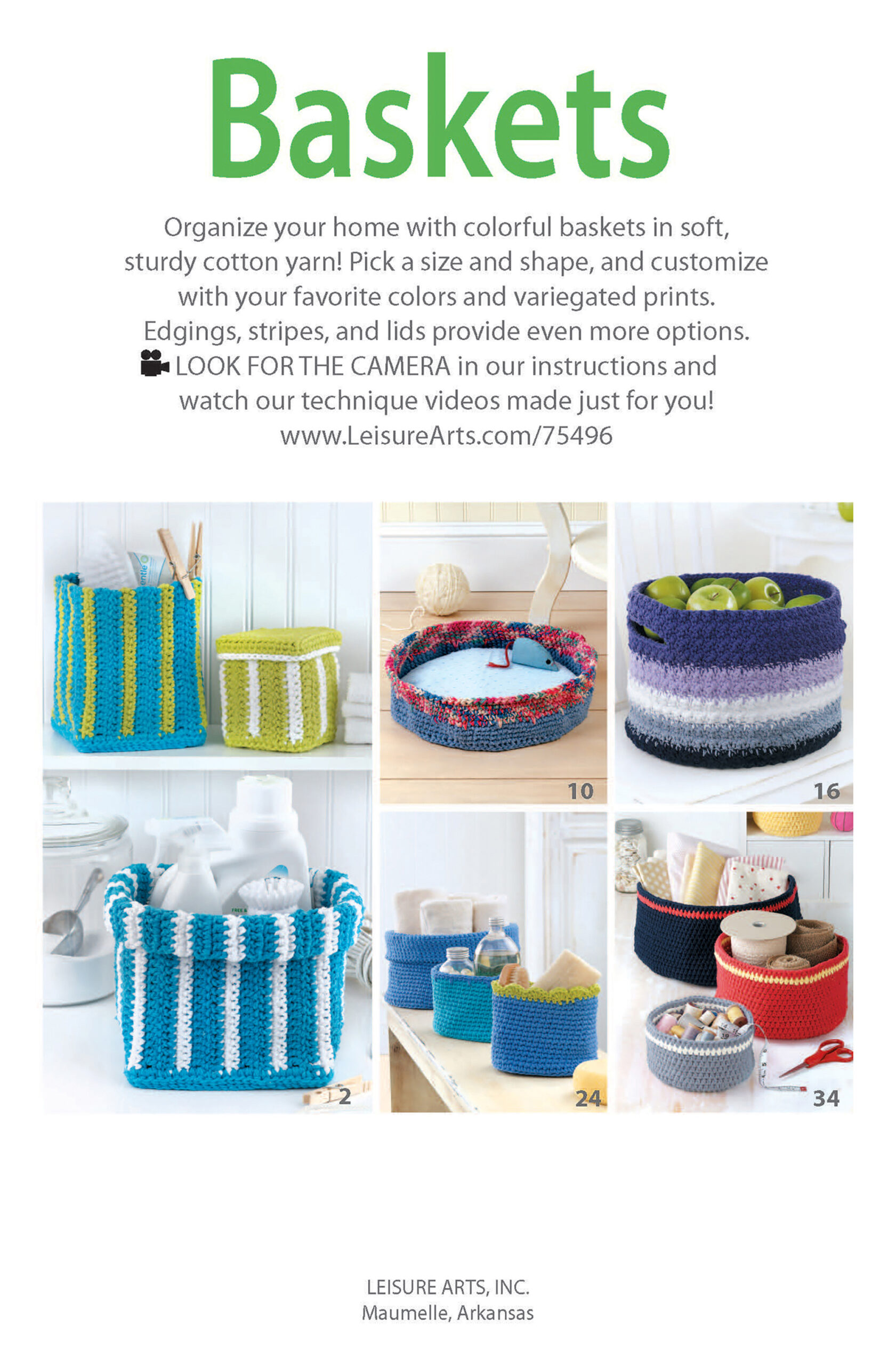 Baskets Crochet- 11 cotton projects sized to organize your space. Create your own baskets for each room in your home for a homemade touch of home decor that keeps you organized. Features a variety of soft yet sturdy basket solutions for organizing your home and furnishing a cozy bed for a pet. Clear instructions are easy to follow, and bonus online technique videos offer extra help. Designs include: baskets, totes, and a pet bed. Projects call for size 4 worsted weight cotton yarn and crochet hooks in US sizes H-8 and I-9. Some designs feature instructions for small, medium and large sizes. Finished baskets measure between approximately 6″ and 12″ in diameter. Easy skill level. 48 pages, softcover pocket size.