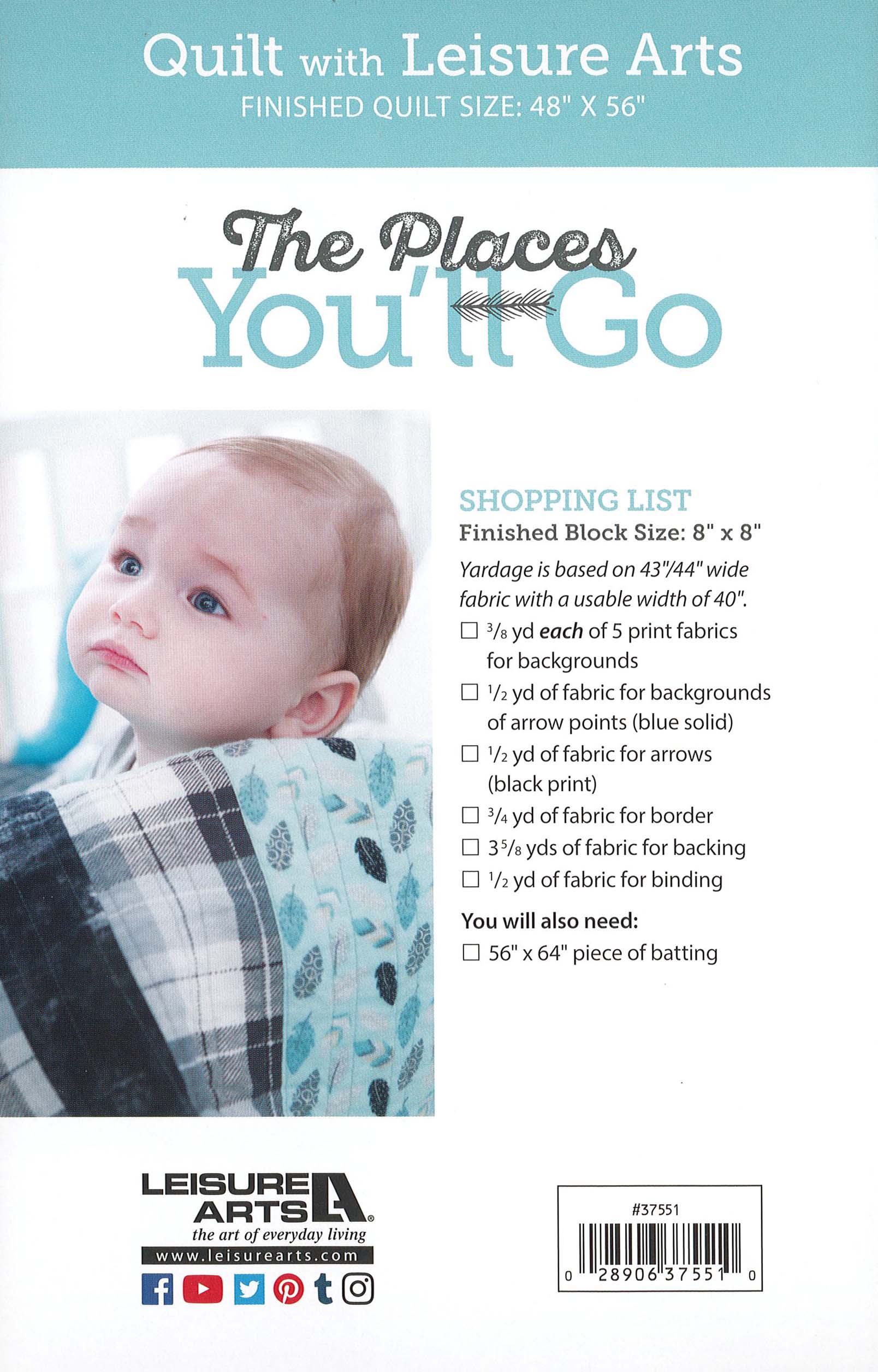 $7.99Leisure Arts The Places You'll Go Quilt Pattern- Send your baby into deep slumber with this cozy quilt. Soft flannels ensure your baby will be wrapped in softness and comfort while patterns and colors perfectly match your nursery. Includes instructions, diagrams, and tips. Finished pieced quilt measures approximately 48"x 56". 16 pages in a soft cover.
