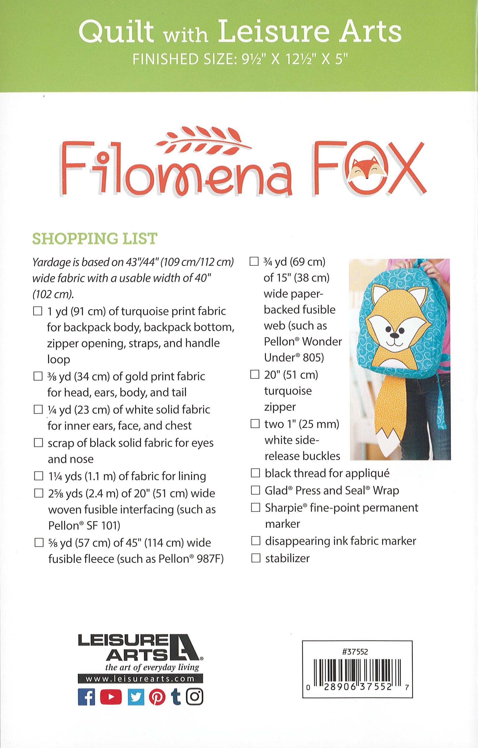 $7.99Leisure Arts Filomena Fox Backpack Pattern- Have their back with this fun quilted fox backpack. Take it to school, sleepovers, or wherever the adventure takes them. Zipper top closing, self fabric straps, interior pockets, and the cutest applique fox. Includes templates, instructions, and tips. Finished backpack measures approximately 9.5"x 12.5"x 5". 24 pages in a soft cover.