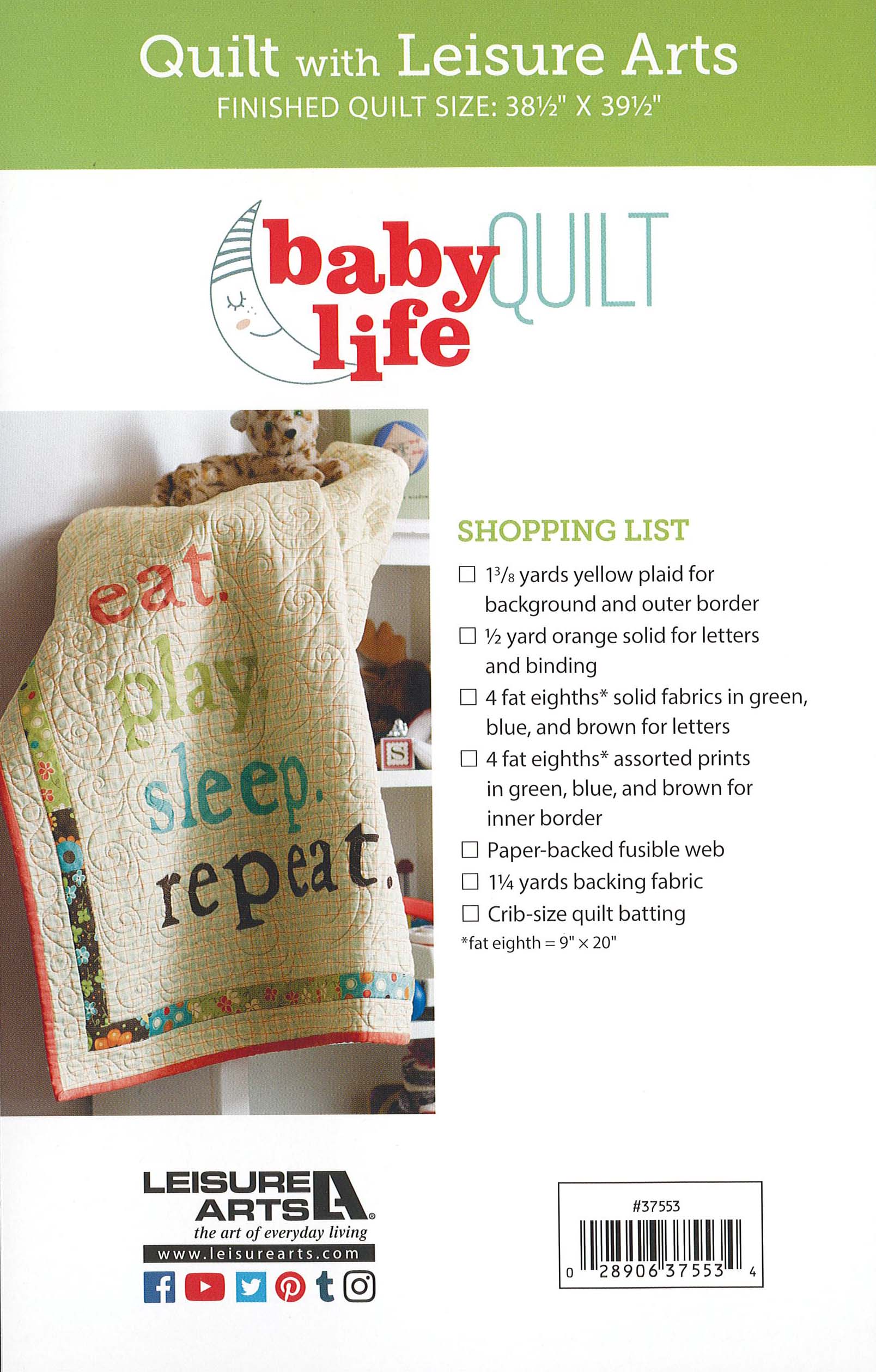 $7.99Leisure Arts Baby Life Quilt Pattern- Express your baby's life motto with this easy-to-make caption quilt. Simple applique reads: eat, sleep, play, repeat. The fun mixture of patterns and solids fit into any nursery and will wrap your baby in total comfort. It can also be personalized with baby's name, birth date, weight, or other information to up the heirloom factor. Finished quilt measures approximately 38.5"x 39.5". 16 pages in a soft cover.