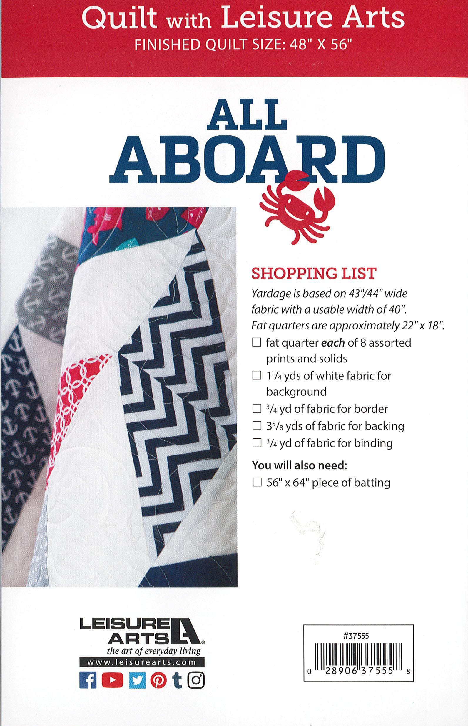 $7.99Leisure Arts All Aboard Quilt Pattern- All aboard for naptime. Seafaring tots and land lovers alike will find comfort when wrapped in this charming quilt. Using nautical, whimsical, or strictly modern fabrics, naptime is sure to be an absolute joy for all involved. You'll be surprised by how quick this pieced quilt is to make. A fat quarter friendly quilt made with half square triangles. Finished size measures approximately 48"x 56". 16 pages in a soft cover.