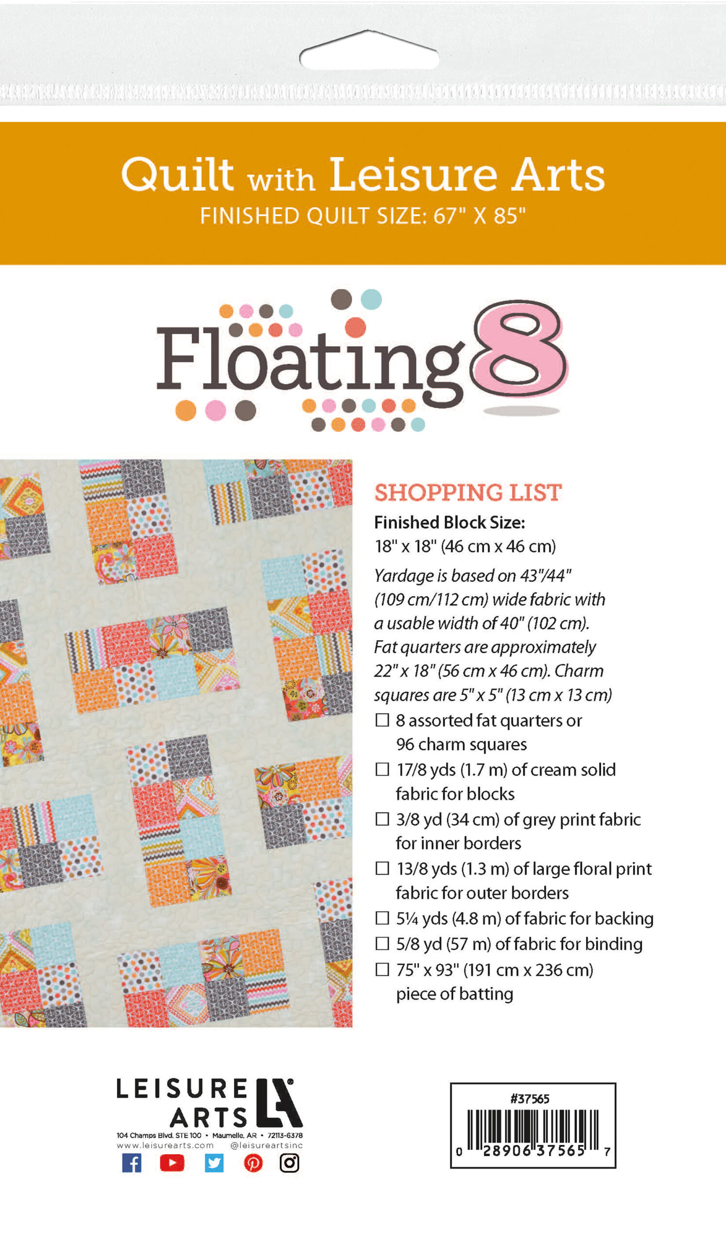 $7.99Leisure Arts Floating 8 Quilt Pattern- Fat quarters or charm squares make this beautifully simple heirloom. Design features sections of 8 squares sewn together alternating between horizontal and vertical alignment. Includes step-by-step design instructions and a general guide to quilting that covers fabrics, rotary cutting, machine piecing, pressing, quilting and much more. Finished quilt measures approximately 67"x 85" with 18"x 18" blocks. 17 page, softcover, pocket sized booklet.