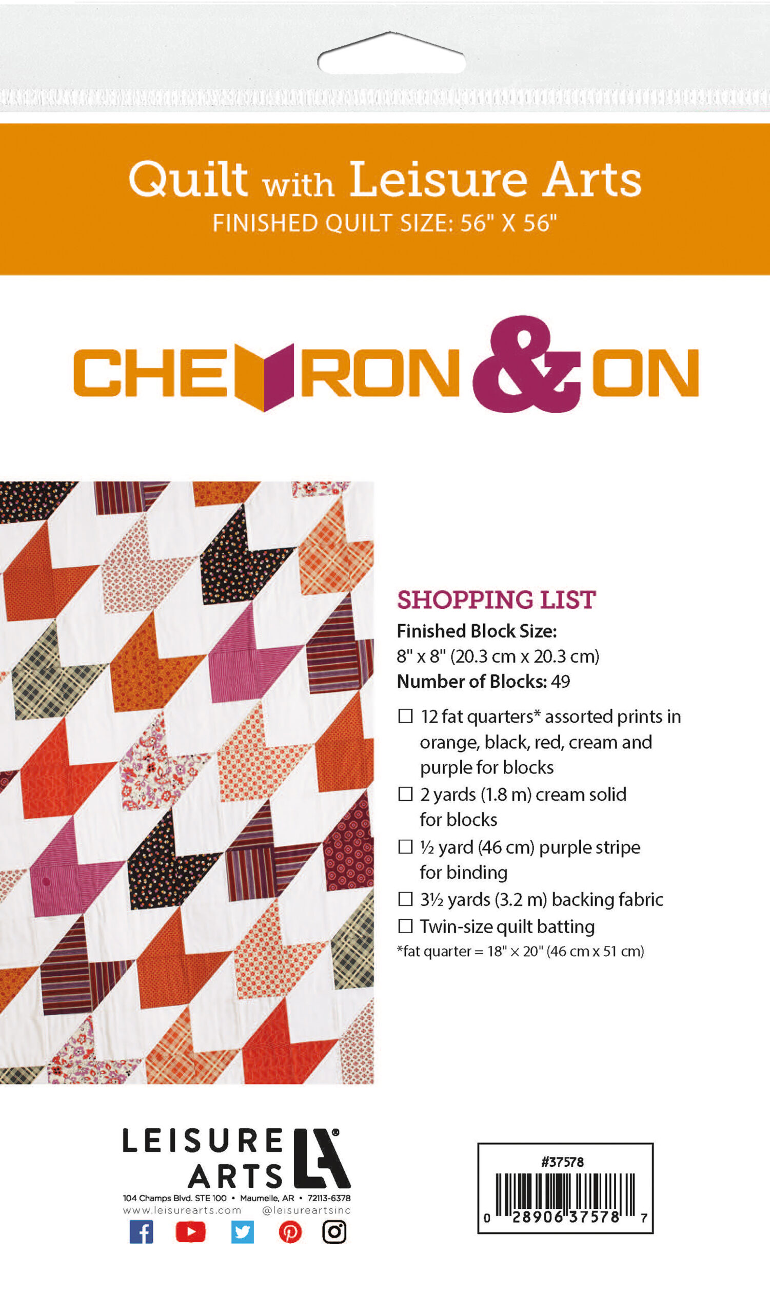 Leisure Arts Chevron & On Quilt Pattern- This quilt has it all, great design, easy piecing and style for days. Design features diagonal rows of chevrons. Includes step-by-step design instructions and a general guide to quilting that covers accurate cutting, easy machine quilting, binding, and much more. Finished quilt measures approximately 56"x 56" with 8"x 8" blocks. 17 page, softcover, pocket sized booklet.