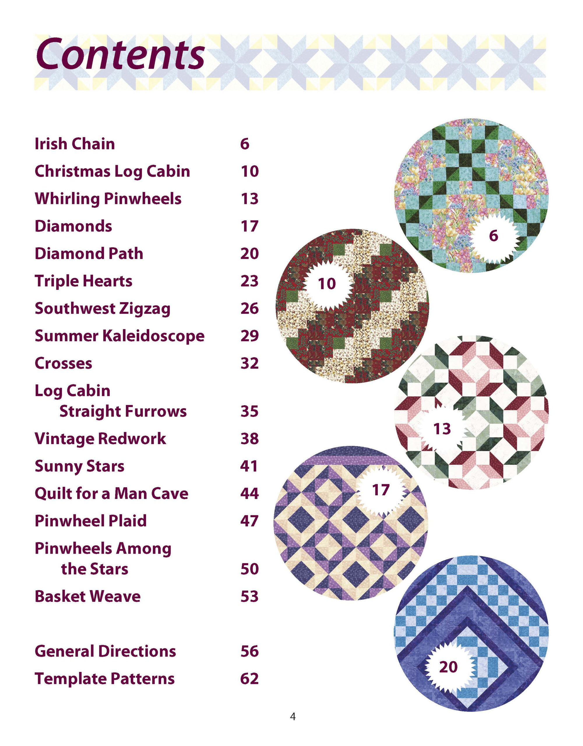 Beginner Friendly Quilting- If you are new to quilting or have been away from it for a long time, the designs in this are perfect projects for you. Each pieced pattern is easy, yet attractive, so you will enjoy making and using these quilts or be happy to give them as gifts. Quilts include: Irish chain, Christmas log cabin, whirling pinwheels, diamonds, summer kaleidoscope, and more. Includes full color, step-by-step diagrams, templates, detailed finishing instructions, and clear cutting requirements for quilt top, borders, and binding. 64 pages, in a softcover.