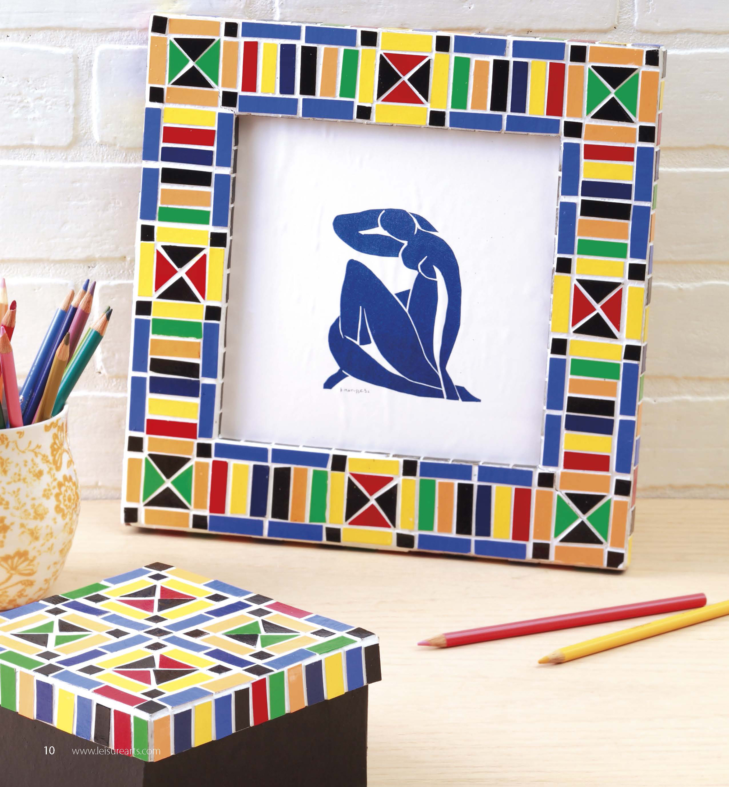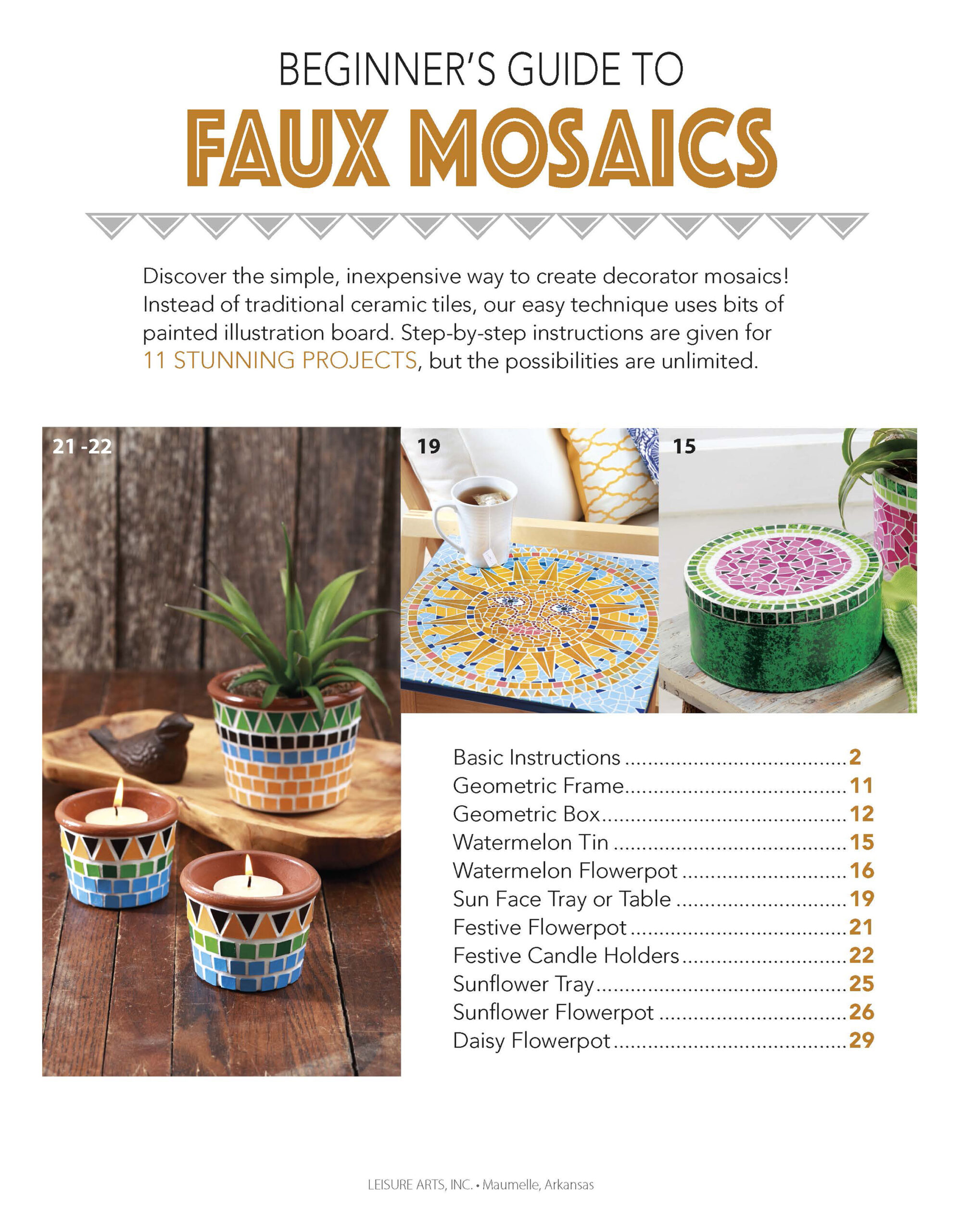 Beginner’s Guide to Faux Mosaics- Easy DIY instructions and tips show how to get the look of ceramic tile mosaics with bits of painted illustration board and spackling. This free-form technique is great way to bring a new look to old picture frames, metal tins and trays, a small table, terra-cotta pots and other items. Patterns, instructions and templates are included for 11 designs. 32 pages in a softcover.