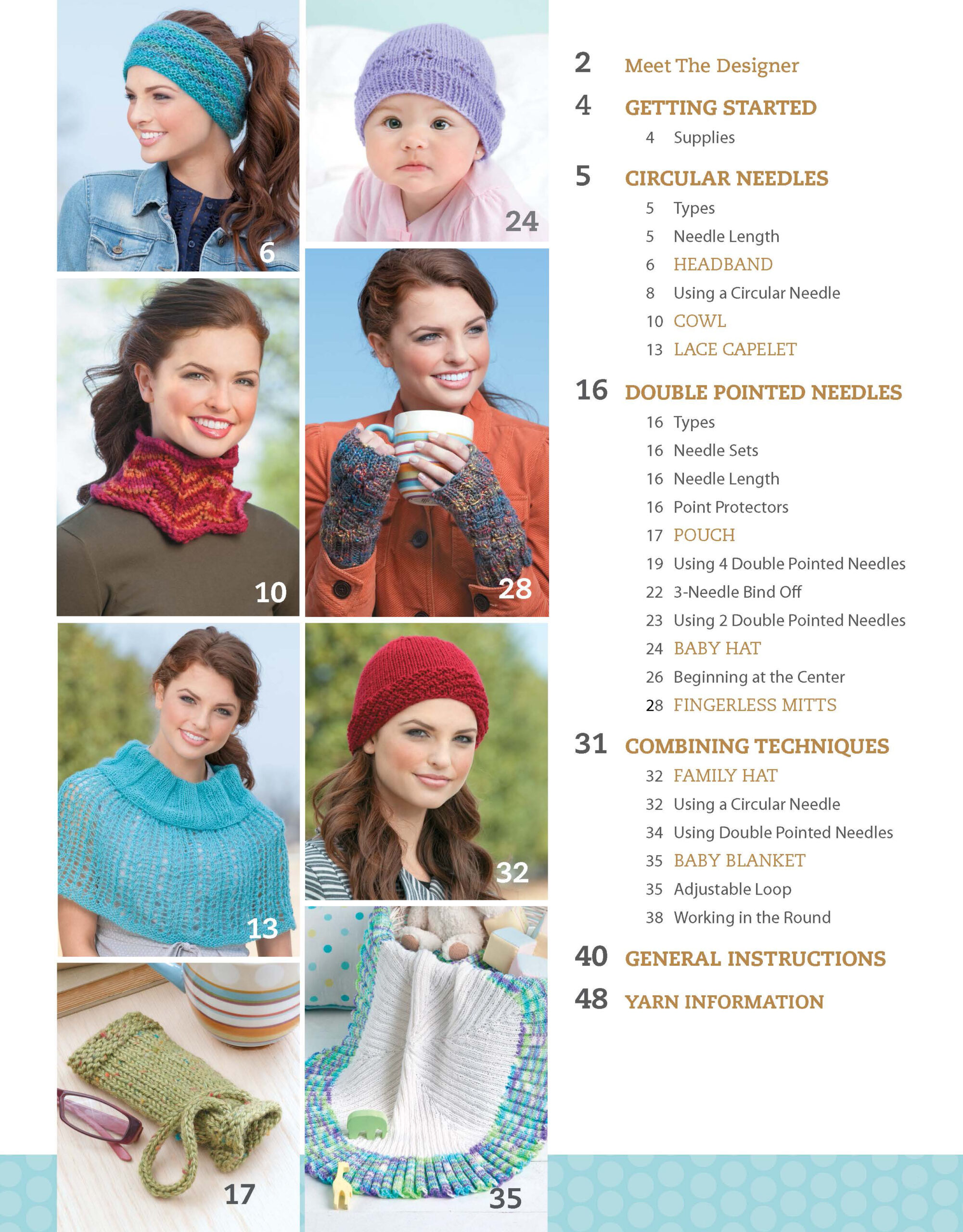 Beginner’s Guide To Knitting In The Round- Learn both double pointed and circular needle basics. For beginners who are ready to advance beyond flat knitting. Working in the round alleviates a lot of seams, gives a better structure to your projects, and makes them more aesthetically pleasing. Featured designs are easy projects for learning the process as well as transitioning from one type of needle to the other. Great for gifts, projects include: headband, cowl, lace capelet, pouch, baby hat, fingerless mitts, baby blanket, and family hat. Includes a guide to circular knitting and step-by-step instructions for each design. Projects call for a variety of yarn weights, knitting needle gauges and cord lengths. Beginner skill level. 48 pages, softcover.