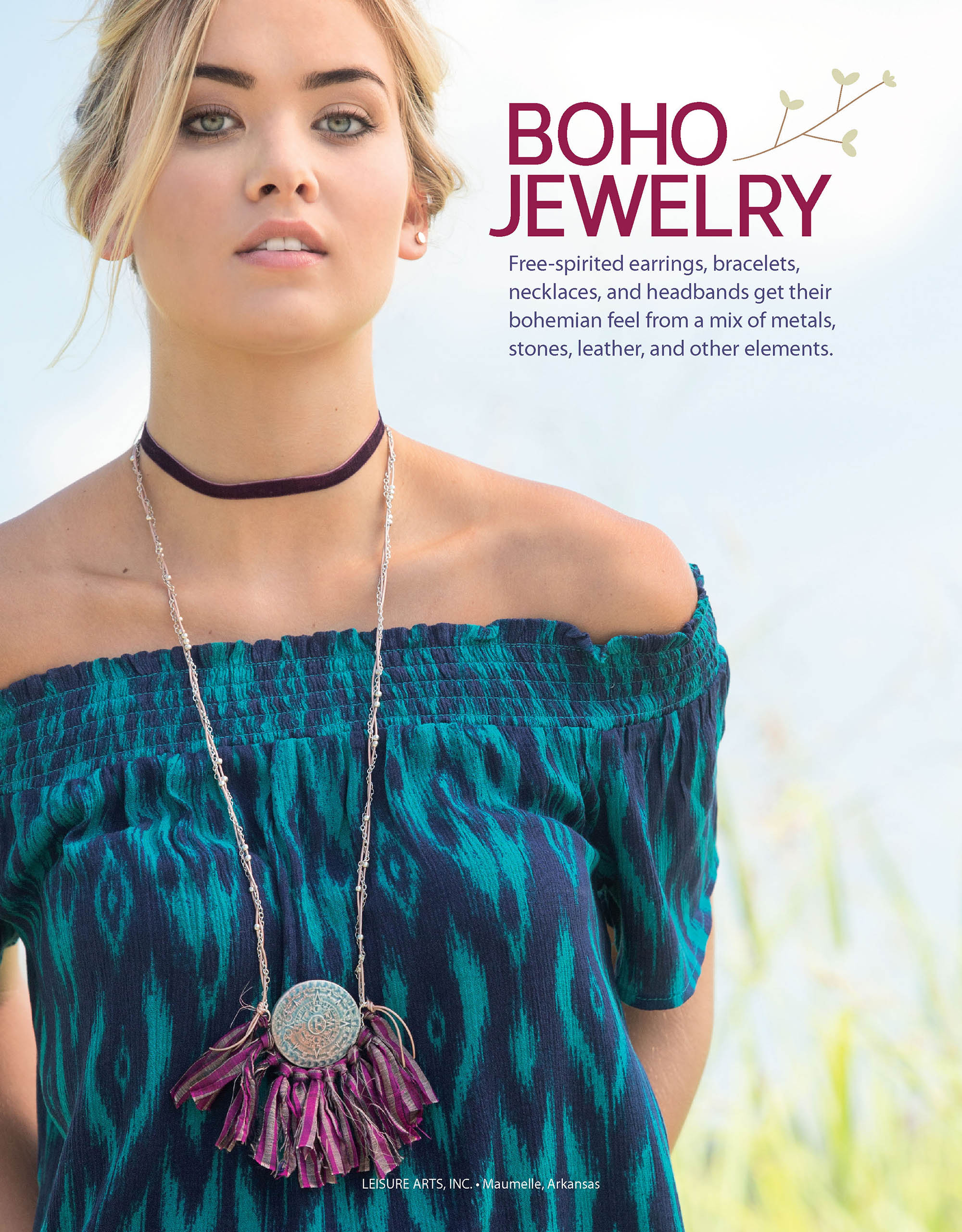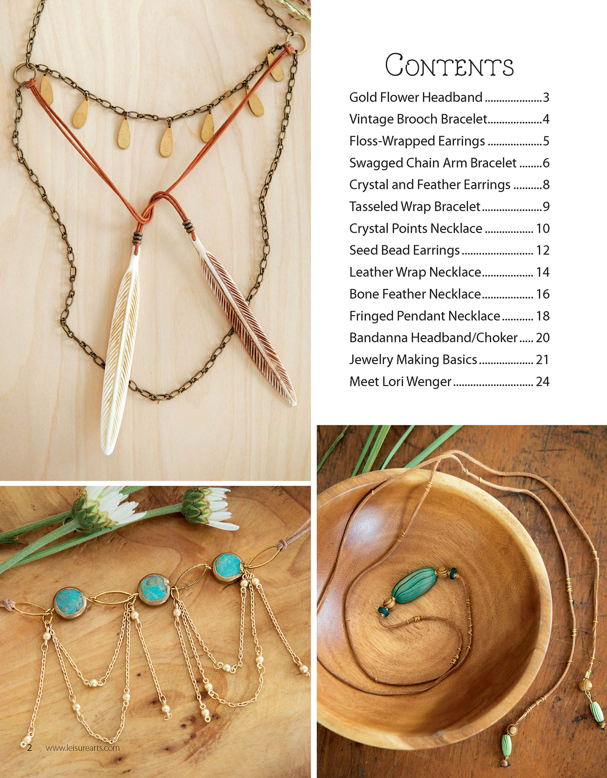 Boho Jewelry- Set your Bohemian soul free with handmade jewelry that gets its rich look from layers of earthy metals, stone beads, and leather. A collection of free-spirited earrings, bracelets, necklaces, and headbands. Step-by-step instructions and basic jewelry making techniques guide you in making these creative designs. 12 projects include: arrowhead necklace and earring set, midnight desert bracelet, eclectic necklace, and more. 32 pages, soft cover.