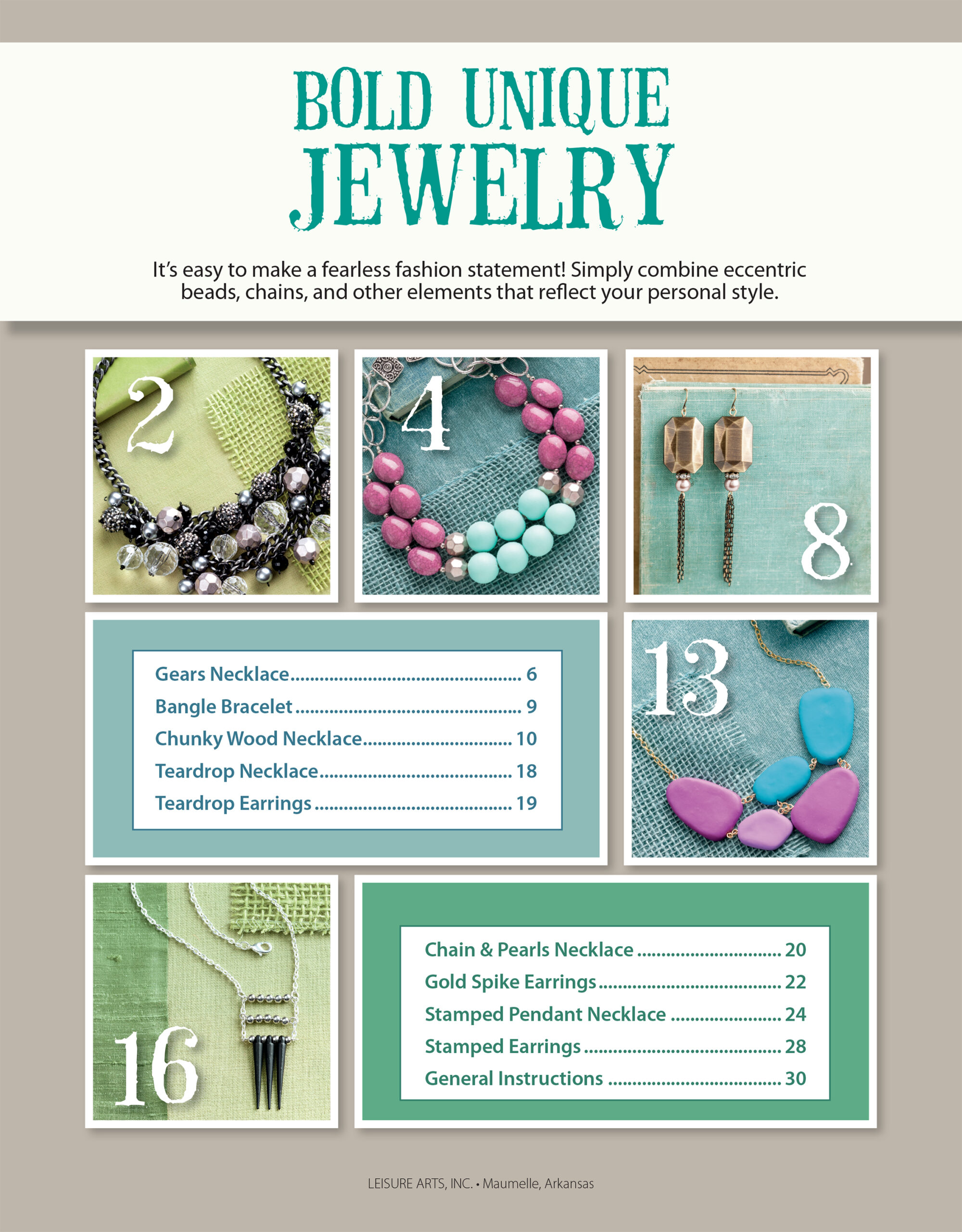 Bold Unique Jewelry- Gather your favorite bold elements to create stylish necklaces, bracelets, and earrings that will make you stand out from the crowd. It’s one of the easiest ways to make a fearless fashion statement. Follow along with the instructions, tips, and tricks to find a new way to reflect your personal style. Designs include: gears necklace, teardrop earrings, bangle bracelet, and more. 32 pages, soft cover.