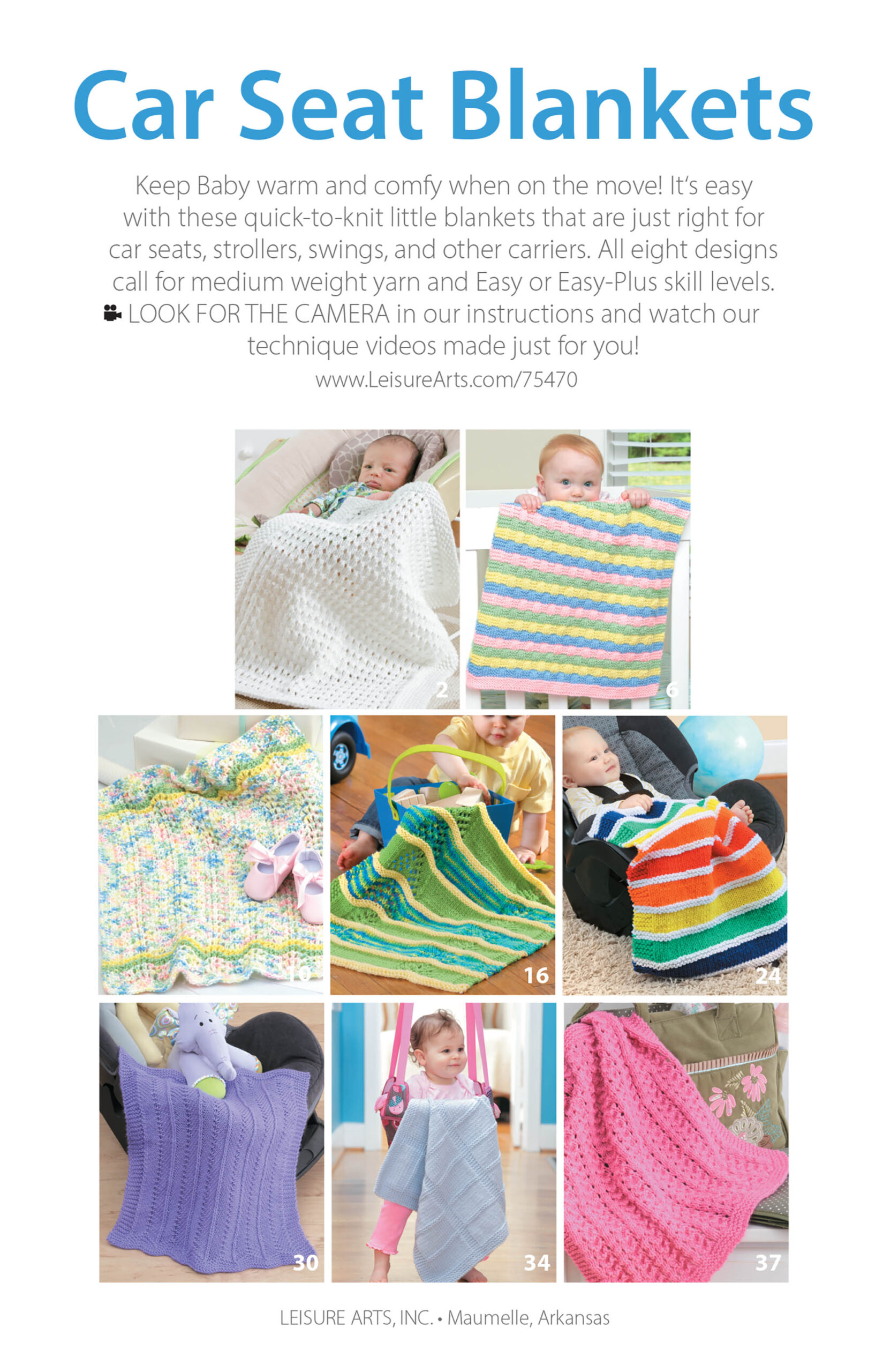 Car Seat Blankets- Keep Baby warm and comfy when on the move. It is easy with these quick-to-knit little blankets that are just right for car seats, strollers, swings, and other carriers. All eight designs call for US size 4 medium weight yarn and sizes 8, 9 or 10 knitting needles. All are easy or easy-plus skill level projects. Blanket sizes range from 16.25”x 20” to 17.75”x 21.5”. 48 pages in a softcover