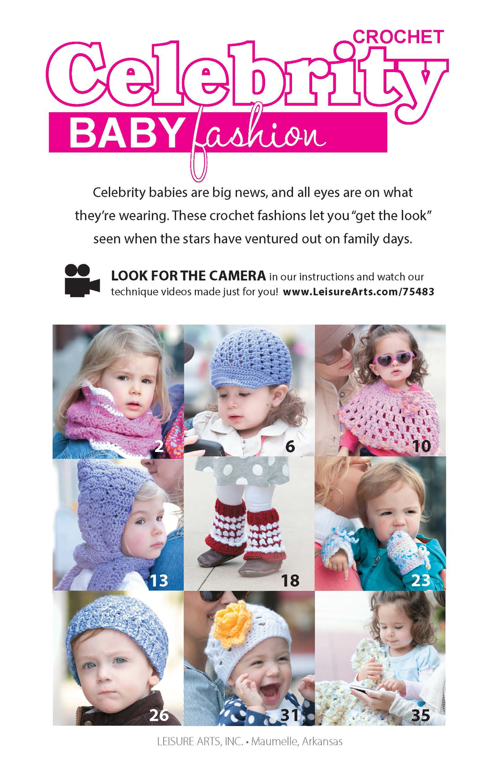 Celebrity Baby Fashion Crochet- Celebrity babies are big news, and all eyes are on what they’re wearing. These 9 designs let you get the look seen when the stars have ventured out on family days. Designs include: cowl, newsboy hat, poncho, leg warmers, and more. Projects call for size 3 light, 4 worsted, or 5 bulky weight yarns and crochet hooks in US sizes F-5, H-8, I-9 and L. Includes step-by-step instructions for each design. Some designs includes instructions for multiple sizes with sizing options ranging between 3 months and 24 months. Easy skill level. 40 pages, softcover pocket size.