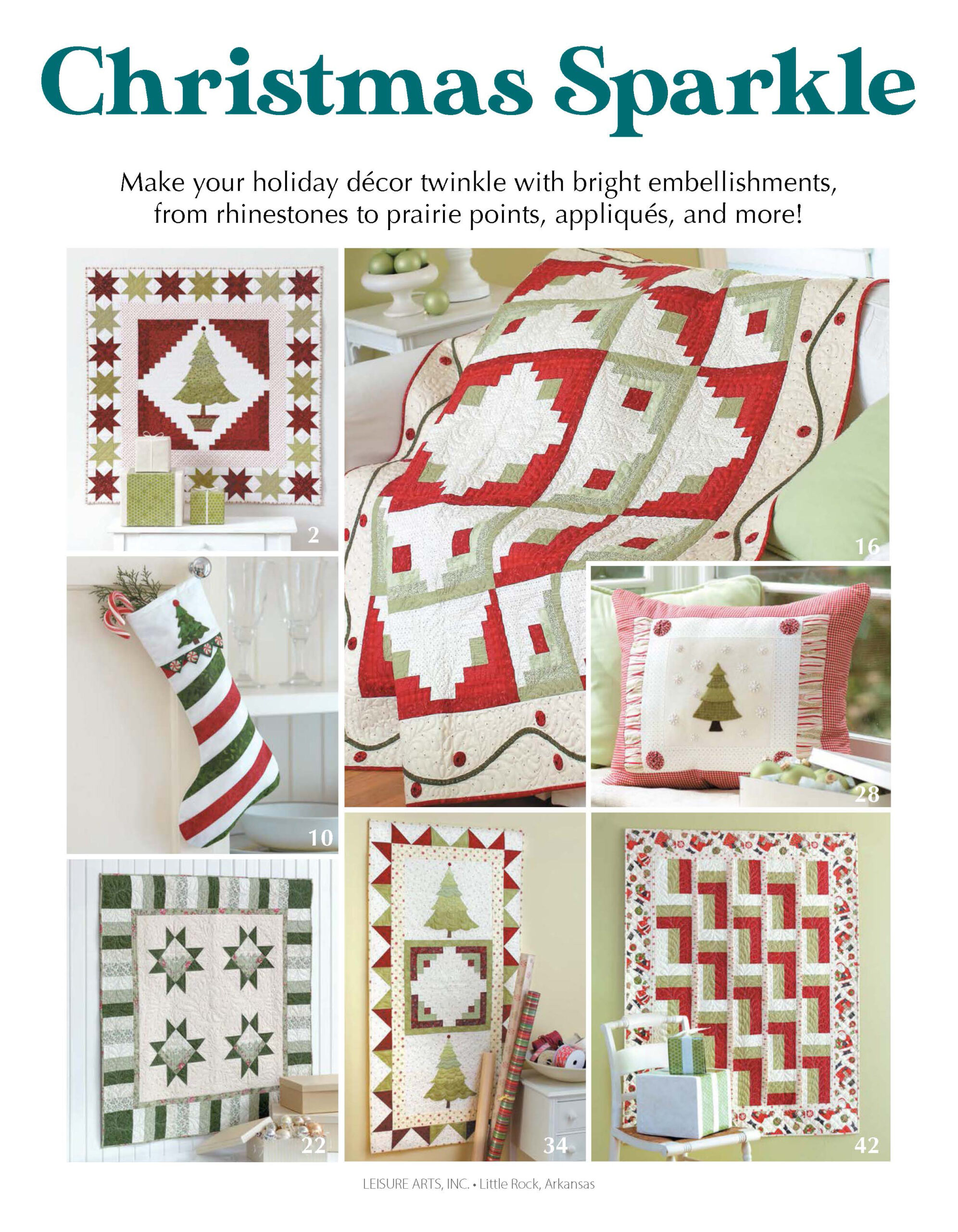 Christmas Sparkle- Christmas decorating has never been so jolly, so fun, or so easy as when you combine your love of the season with your love of quilting and applique. These 7 merry designs offer festive little ideas for every corner of your home. Put a Christmas tree pillow on the chair, a pair of evergreens on the wall, or a holly-bordered throw on the sofa. Whimsical embellishments include cotton and wool appliques, rhinestones, fabric yo-yos, gathered flanges and even prairie points. Some designs are fat quarter friendly. Finished designs measure between approximately 7 1/4″x 14 1/4″ and 61″x 61″. Intermediate skill level. 60 pages, softcover.