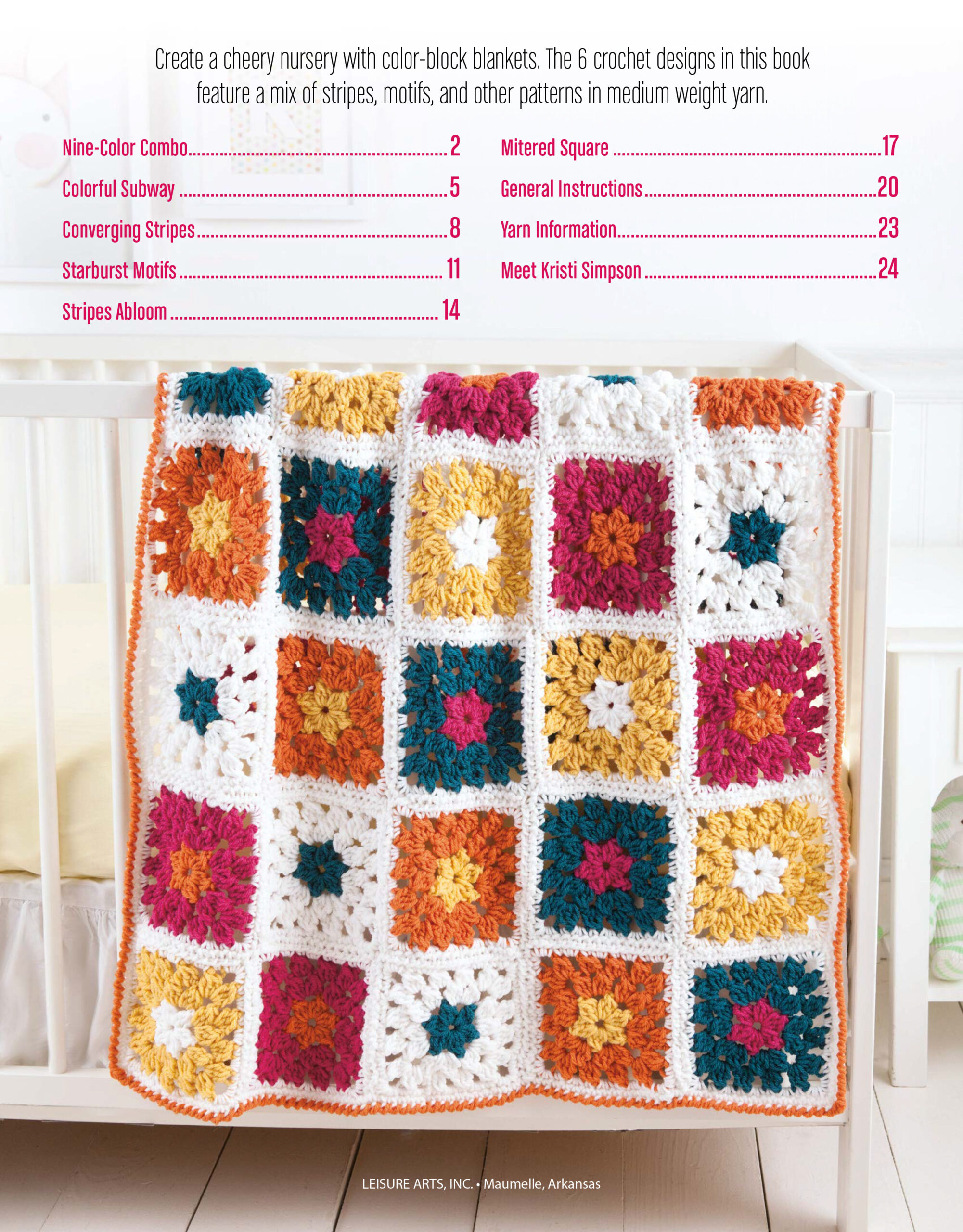Color Block Baby Blankets Crochet- Colors as fresh as a newborn baby give a bold look to these 6 crochet designs. Match any decor for a bold statement. Choose from a variety of easy styles featuring a mix of stripes, motifs, and other patterns in medium weight yarn. Designs include: color-block rainbow, offset tiles, converging stripes, and more. All patterns are beginner or easy skill level. 24 pages, soft cover.