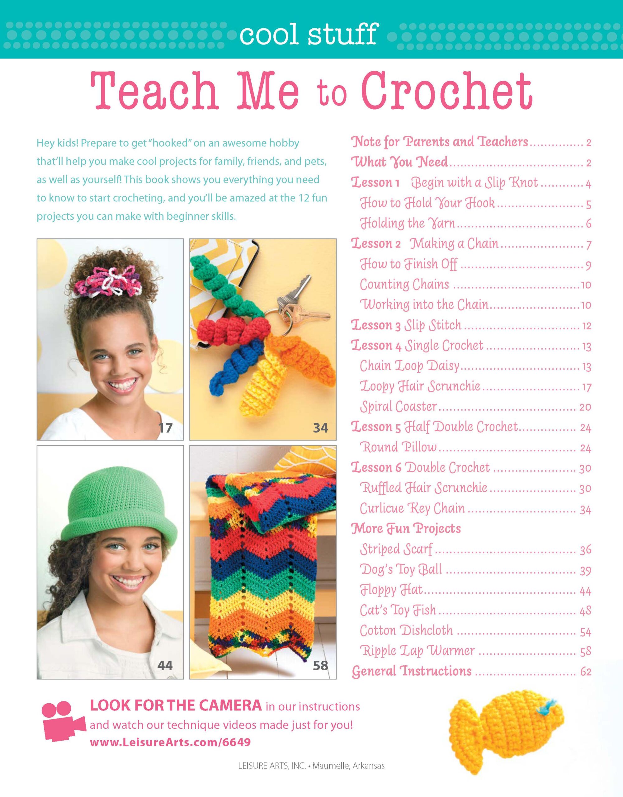 Cool Stuff Teach Me To Crochet- Simple lessons with projects designed with kids in mind, but great for learners of all ages. With full-color photography depicting every step and examples that help you visualize key concepts, learning how to crochet has never been easier. 12 fun projects for daisies, scrunches, coaster, pillow, key chain, striped scarf, pet toys, floppy hat, dishcloth and ripple lap warmer. Uses size 4 medium weight yarn and US size G, H, I and K crochet hooks. Helpful notes for parents and teachers are included. Written for ages 9 to 14, but great for adult beginners as well, with step-by-step photos and clear instructions. 64 pages, softcover.