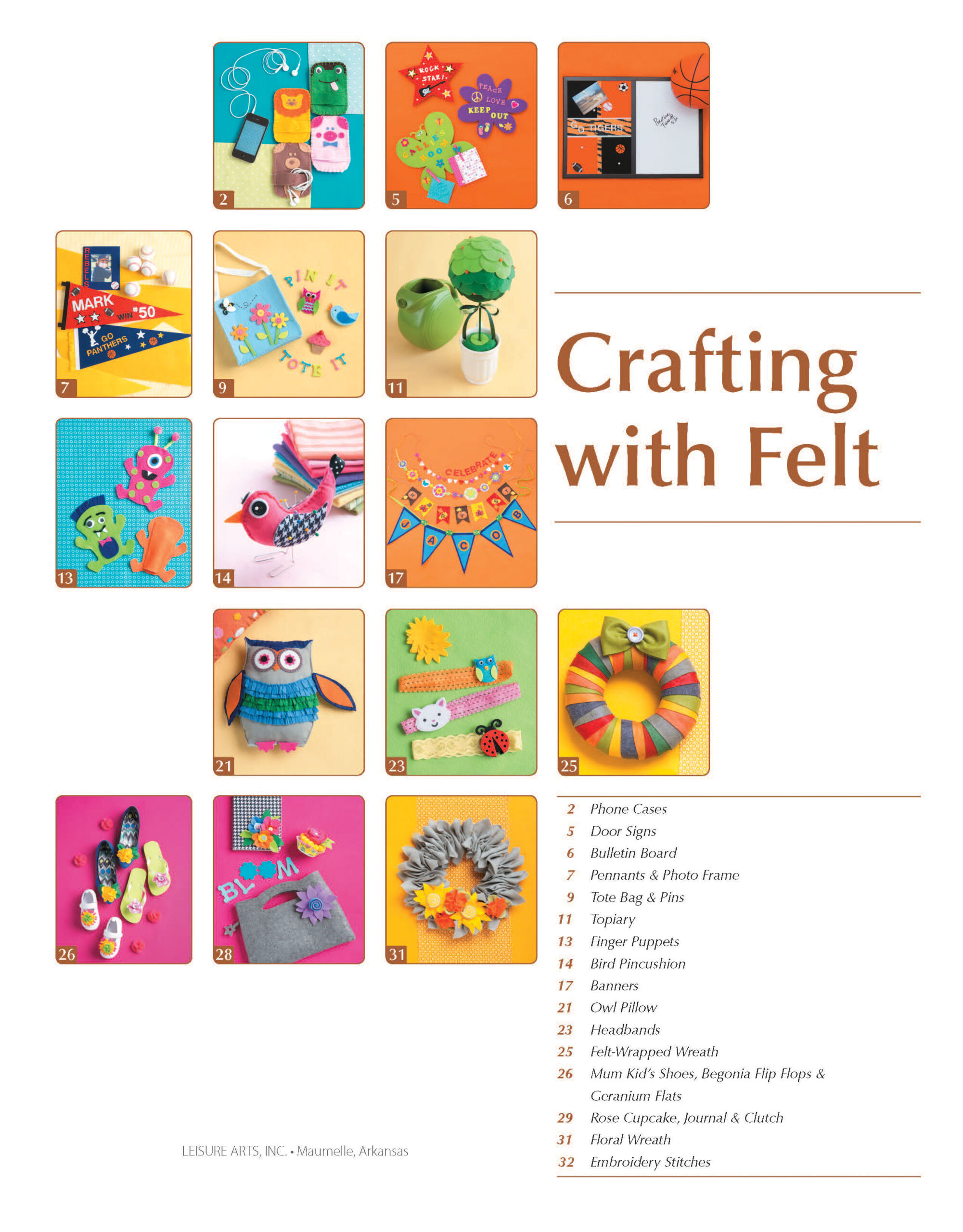 Crafting With Felt- Color your world with fun, easy felt. Jazz up your home and fashions, make kid-pleasing toys and gifts, and adorn sweet baby accessories. You could even get the kids involved in any of these 31 colorful creations. Designs include: flowers, finger puppets, phone cases, door hangings, and more. 32 pages, soft cover.