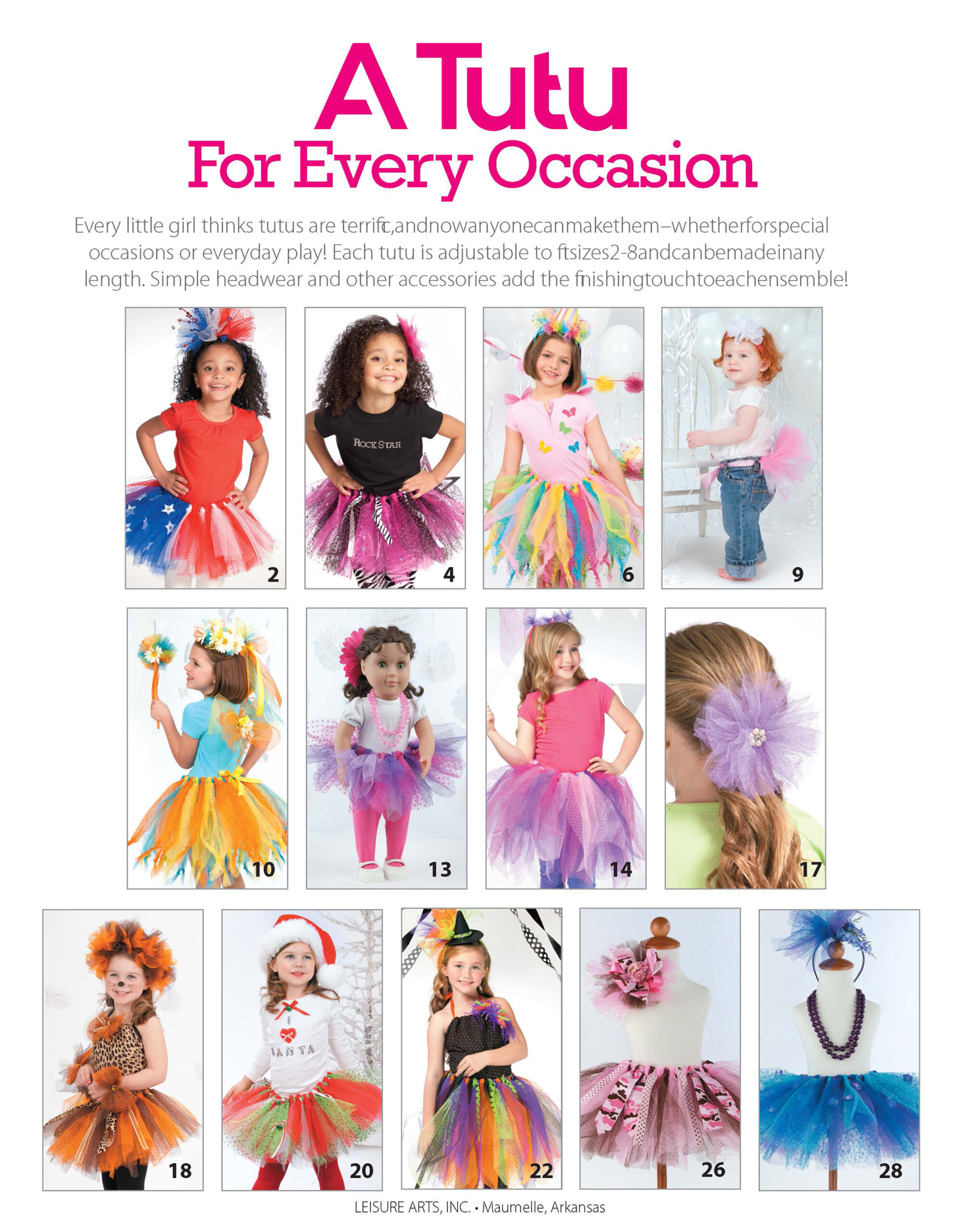 A Tutu For Every Occasion- Quick and easy celebration projects for holiday, birthday and everyday. Anyone can make these tutus for the children in their life. For special occasions, holidays, or everyday play. Each is adjustable to fit US children’s sizes 2-8 and can be made any length. Themes include: patriotic, Halloween, Christmas, rocker, princess, forest fairy, jungle and more. Each can be made using tulle, ribbon and hot glue. No sewing required. Beginner skill level. 32 pages in a softcover.