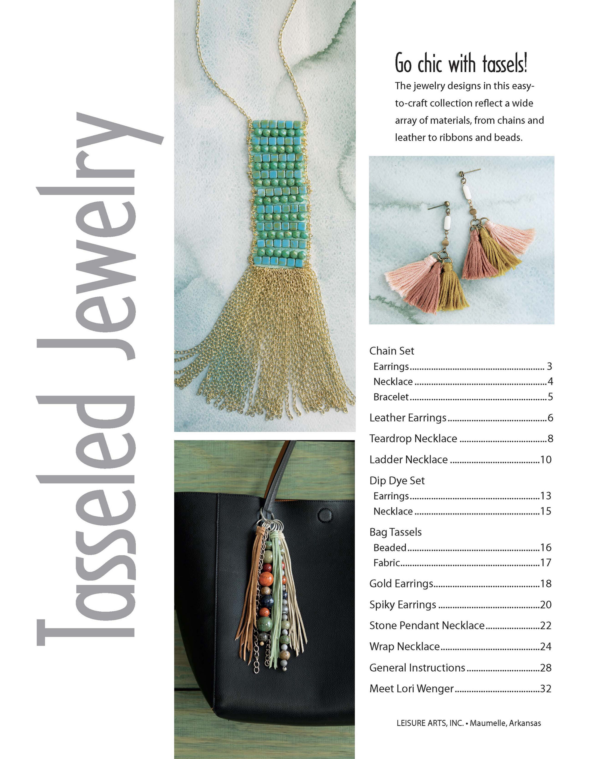 Tasseled Jewelry- The jewelry designs in this easy-to-craft collection reflect a wide array of materials, from chains and leather to ribbons and beads. Add edgy style to your fashion look with easy DIY jewelry that’s lush with trendy fringe tassels. Make a chain set that includes earrings, necklace, and bracelet. Designs also include leather earrings, teardrop necklace, ladder necklace, bag tassels, spiky earrings, stone pendant necklace, and more. Photos and step-by-step instructions make this easy. 32 pages in a soft cover.
