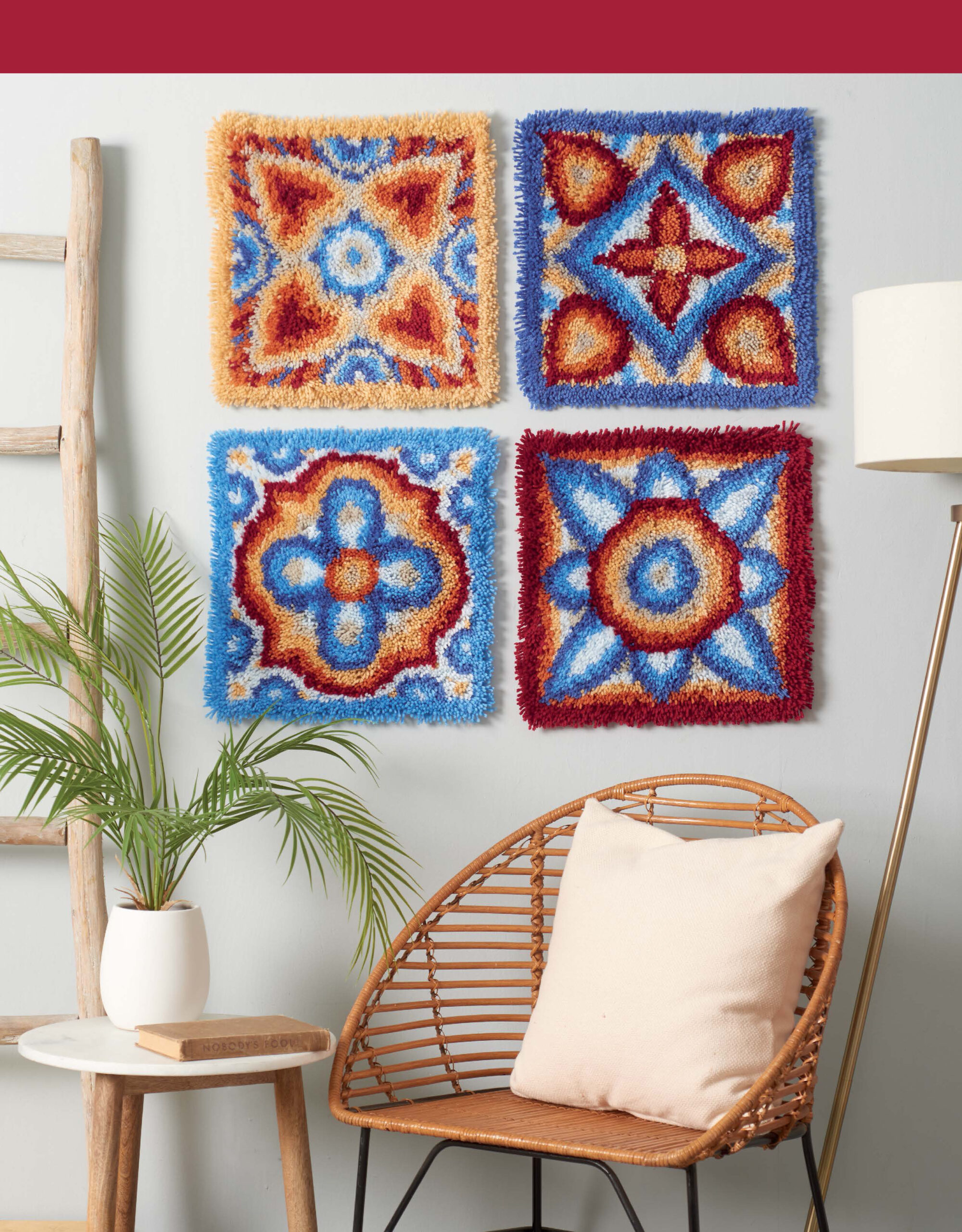 Crafts Timeless Tiles In Latch Hook- Enjoy these four interesting and enduring designs that you can use throughout your home in a number of ways! Once your tiles are completed, you can use them as wall hangings or even turn them into stunning pillows. Our detailed instructions, complete with color charts and helpful diagrams, will walk you through each step of completing these tiles. 20 page, soft cover.
