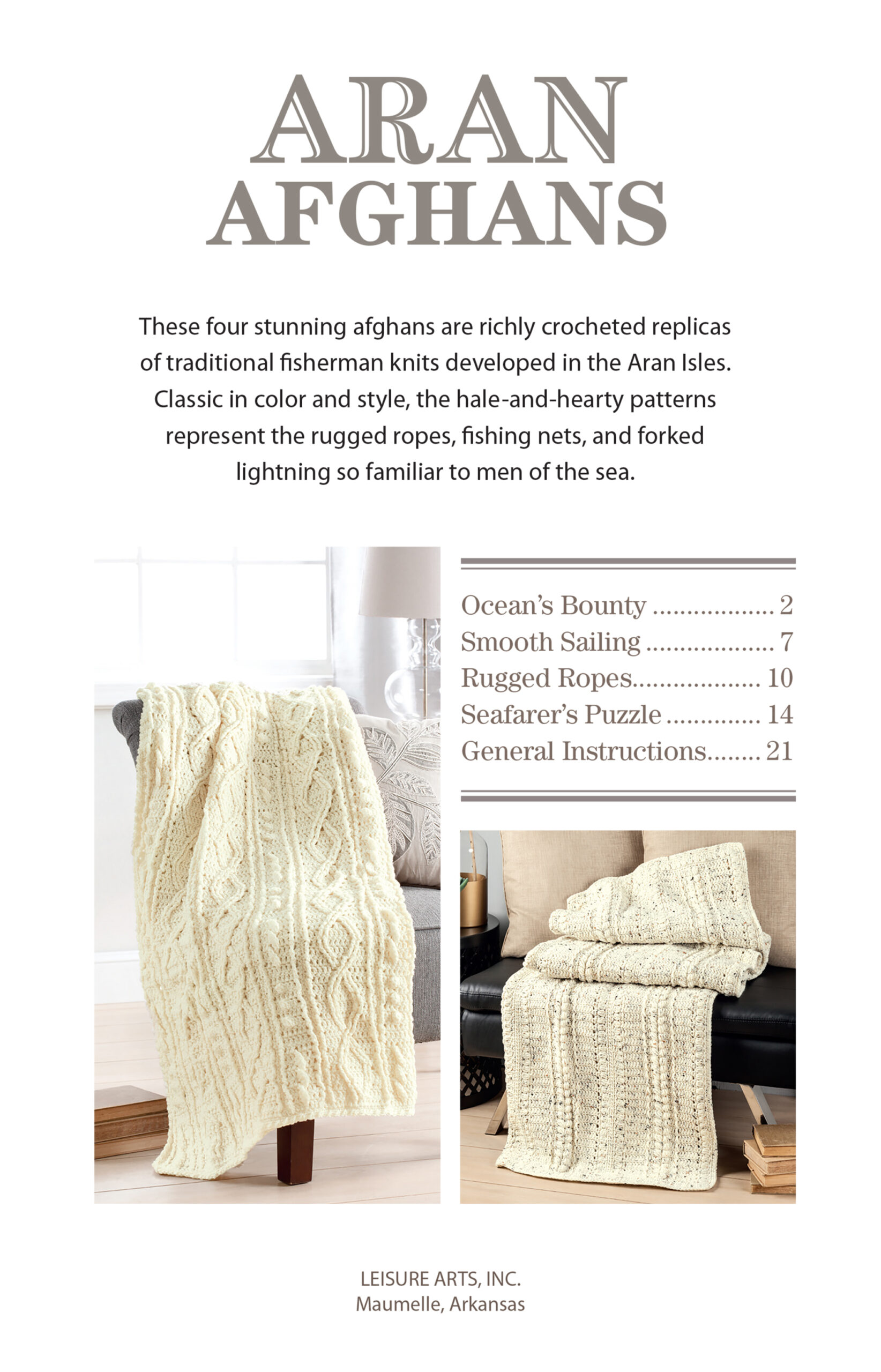 Crochet Aran Afghans- Handsome details make fisherman-style throws look great in any decor. These 4 stunning afghans are richly crocheted replicas of traditional fisherman knits developed in the Aran Isles. Classic in color and style, the hale-and-hearty patterns represent the rugged roped, fishing nets, and forked lightening so familiar to men of the sea. Designs include: ocean’s bounty, smooth sailing, rugged ropes, and seafarer’s puzzle. All intermediate skill level projects that use size 4 medium weight yarn and US size G, I or J crochet hooks. 24 pages in a softcover.