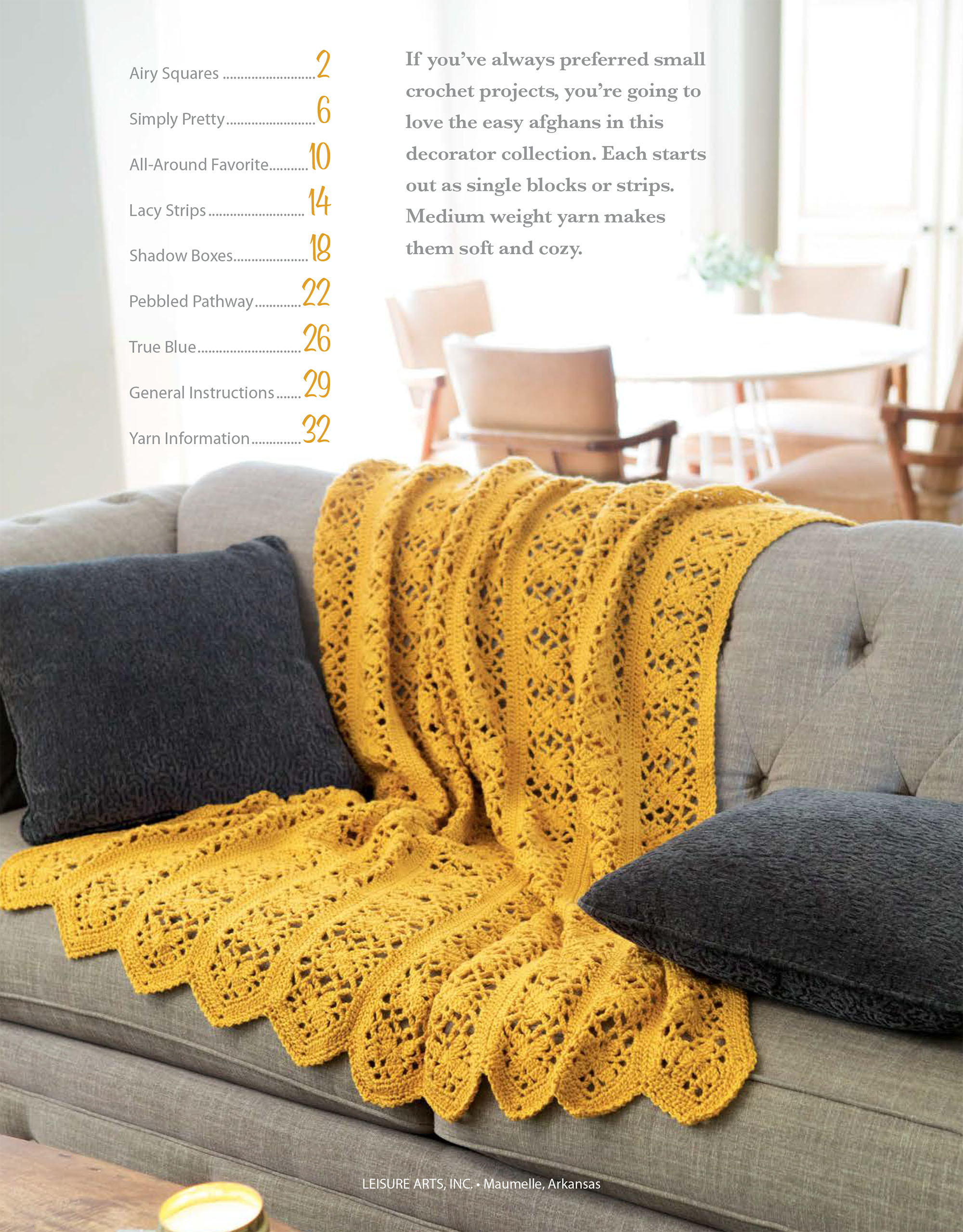Crochet Blocks & Strips Crochet- If you’ve always preferred small crochet projects, decorating your home is now easy with 7 different block-by-block or strip-by-strip designs. These easily transported motifs are great for on the go projects that are then quickly assembled with whipstitches that blend into your project. Make your own with size 4 medium weight yarn and US size H, I or J crochet hooks. Includes stitch guides, diagrams, instructions and general crochet information. Finished afghan sizes measures between approximately 47″x 61″ and 50″x 67″. Easy skill level. 32 pages, softcover.