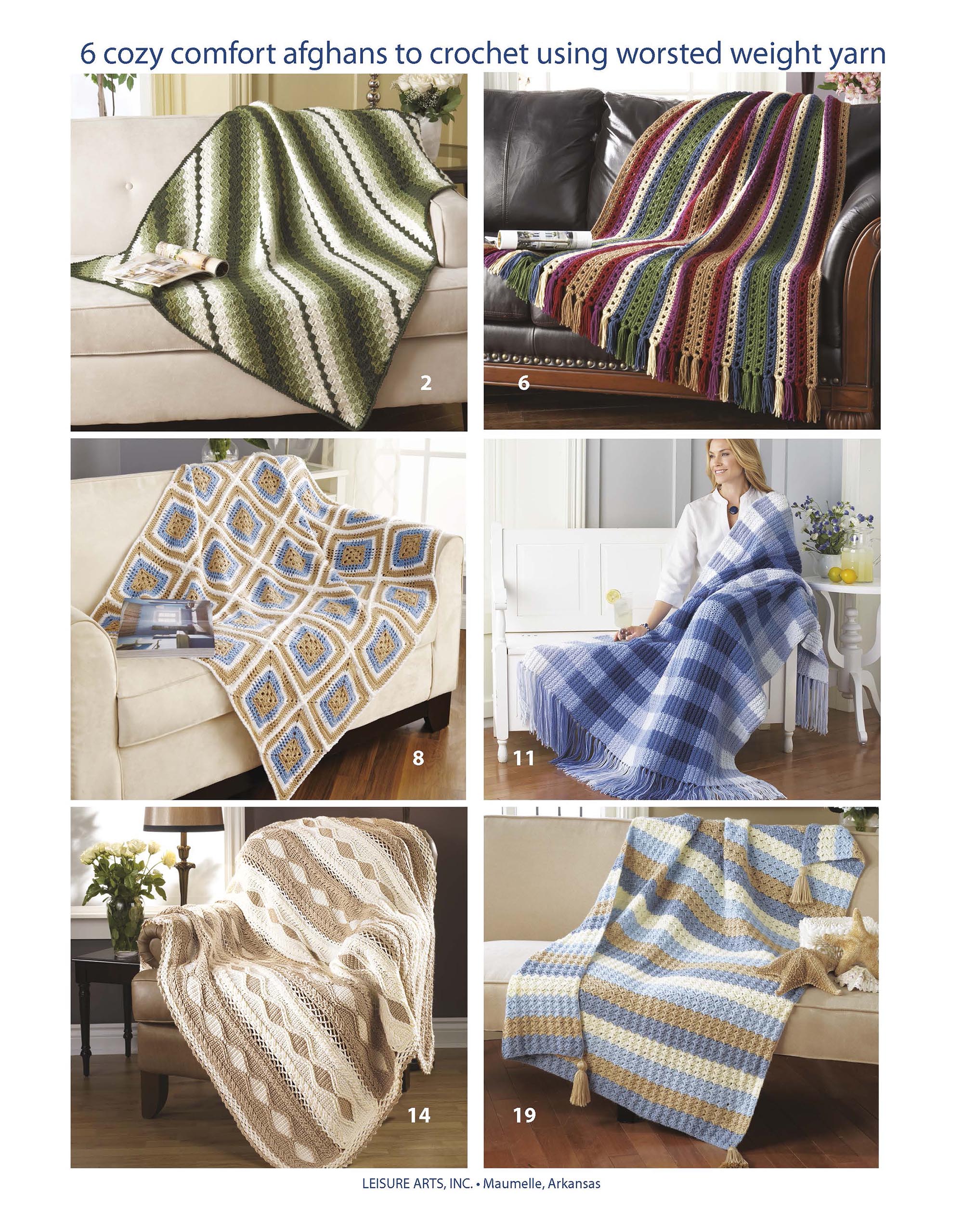 Crochet Cozy Comfort Afghans- Curl up with one of your own cozy creations from the best of Mary Maxim collection. Features six designs to crochet using various techniques to give you unique looks and add skills to your crochet toolbox. General crochet instructions, step-by-step pattern instructions, diagrams and full-color photos included. Designs include: diagonal stripes, vertical stripes, reflections, perfectly plaid, and more. Projects use US size 4 worsted weight yarn and varied hook sizes ranging from H-8 to J-10; 5 to 6 millimeters. Finished afghan sizes measure between 40″x 50″ and 54″x 58″. Intermediate skill level. 24 pages, softcover.