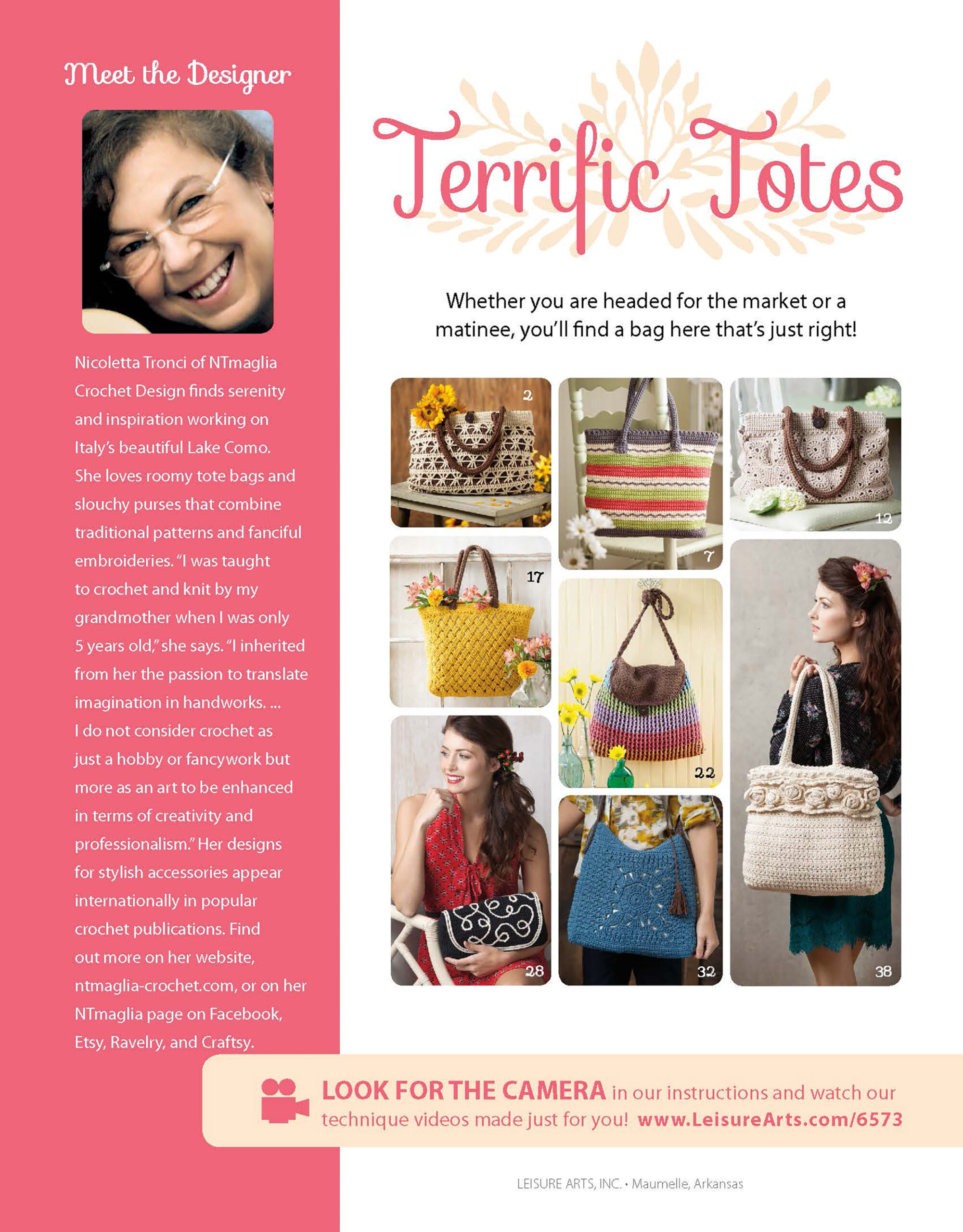 Crochet Terrific Totes- Dress to impress with distinctive bags. The sublime bags in this Italian designer-inspired collection have timeless fashion allure. All crocheted using medium weight cotton yarn, the 8 styles in this range from chic to casual and will all fit into your current wardrobe. Designs include: terra cotta tote, twill weave tote, arabesque clutch, and more. 48 pages, soft cover.