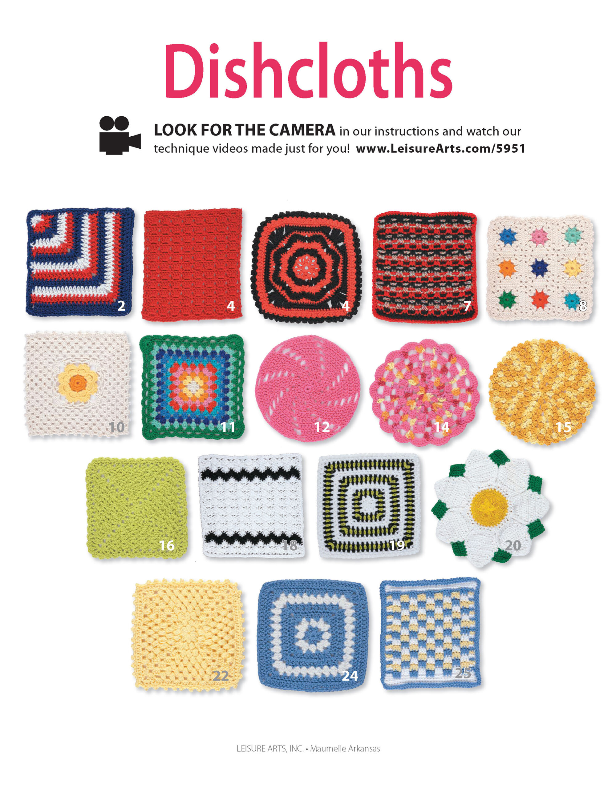 Crochet Dishcloths- Make your kitchen and bathroom more colorful and luxurious. 17 different designs will add texture and color to any room, while step-by-step instructions are built for beginners .Designs include: stripes, circles, flowers, spirals, stripes, and more. All designs are easy skill level. 32 pages, soft cover.