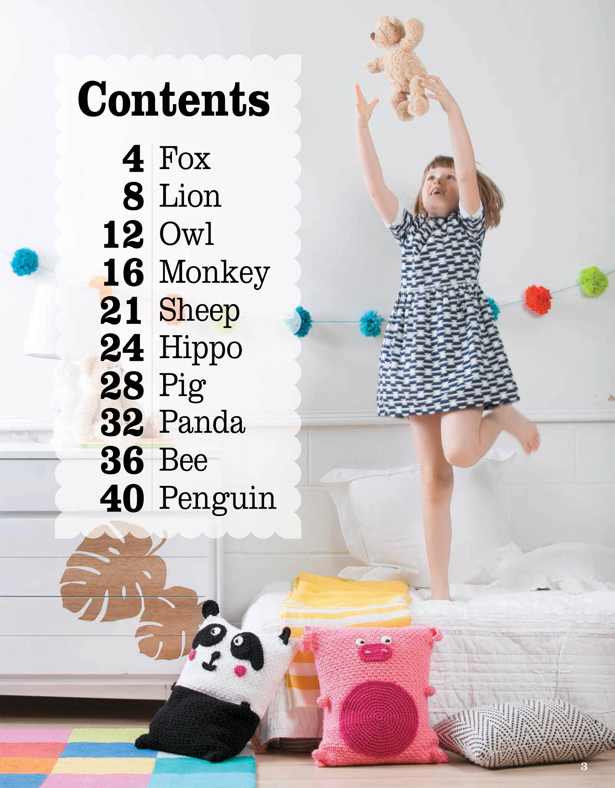 Crochet Kid’s Animal Pillows Crochet- No one can resist hugging these fun characters. Each is crocheted using medium weight yarns, and all patterns are easy skill level. They have a lovable face, and some even have tails, feet, and other dimensional features. These animal pillows make great decorative accessories for a child’s bedroom, but they also offer comfort and companionship while riding in a car. Designs include: lion, hippo, pig, panda, and more. 48 pages, soft cover.