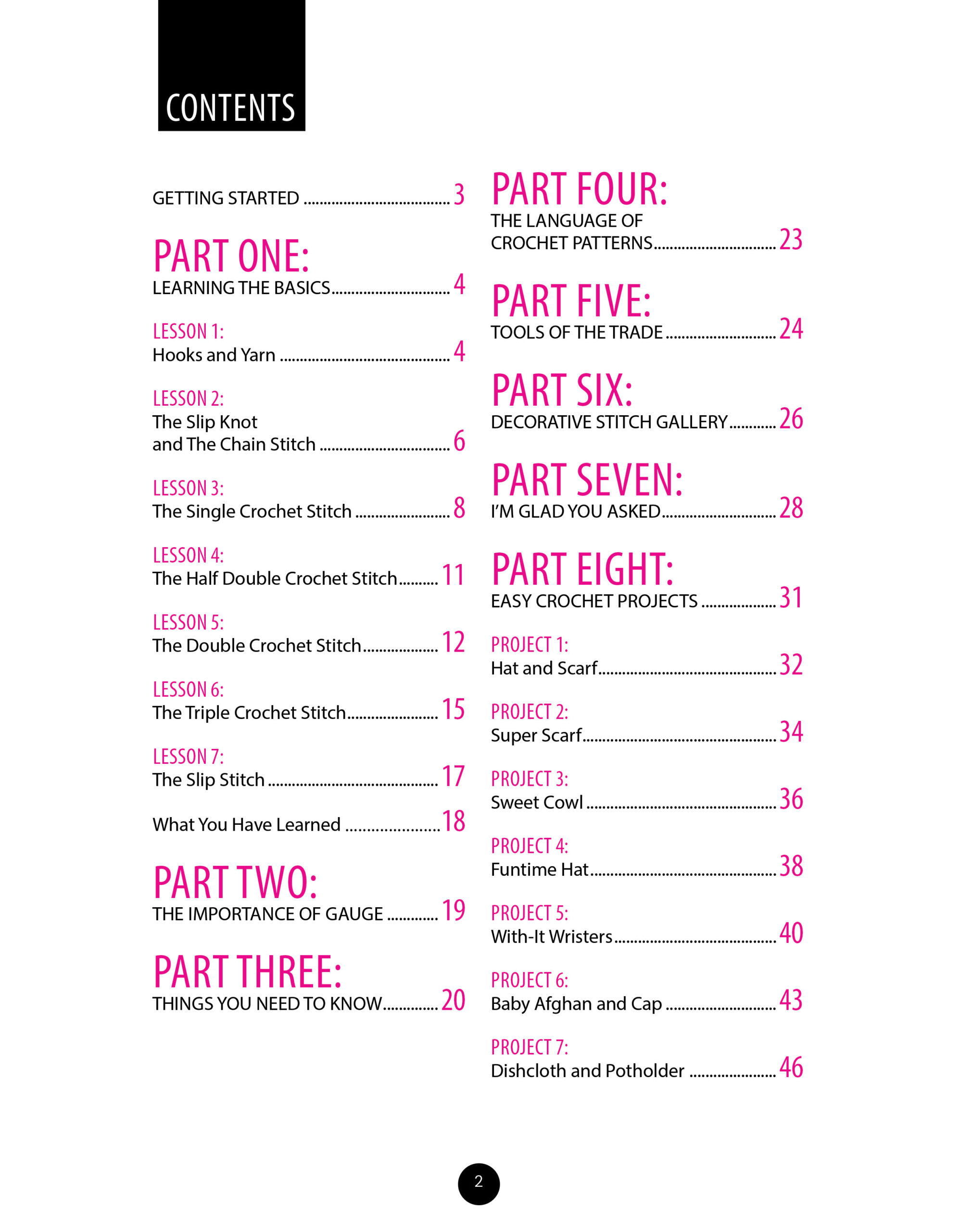 Crochet Learn To Crochet The Easy Way- Features beginner-level projects that includes sections about the language of patterns, tools, a stitch gallery, commonly asked questions, and more. 30 informative pages featuring diagrams and step-by-step instructions. Projects require a variety of different yarn weights including US size 3 light, 4 worsted and 5 bulky. Hook size requirements vary between size F-P; 5 to 15 millimeters. 48 pages in a softcover.