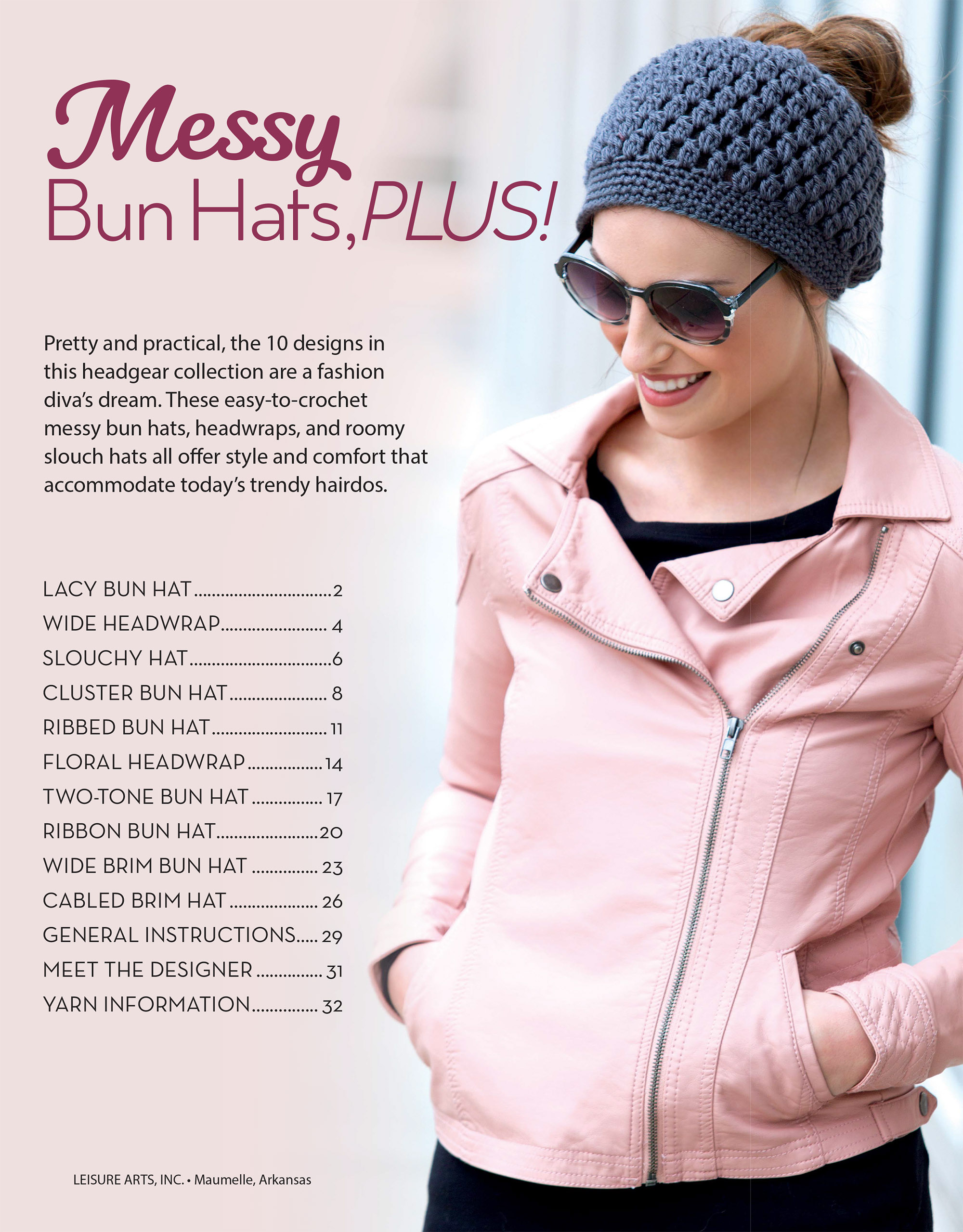 Crochet Messy Bun Hats, Plus! Crochet- Need a hair-friendly hat that won’t mess your messy bun? Choose any of the 10 pretty and practical toppers. These easy-to-crochet messy bun hats, headwraps, and roomy slouch hats are all great to wear with today’s trendy hairdos. Designs include: lacy bun hat, wide headwrap, slouchy hat, two-tone bun hat, and more. All designs are listed as easy skill level. 32 pages, softcover.
