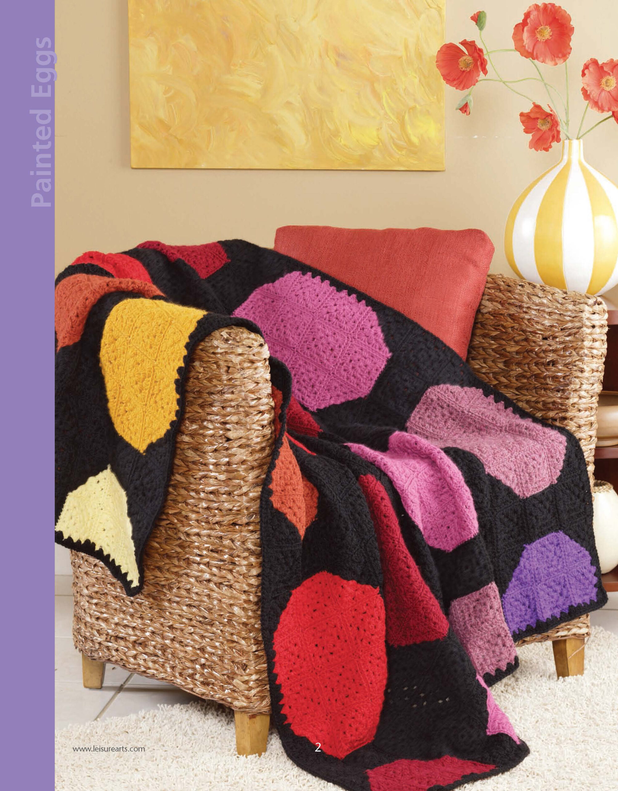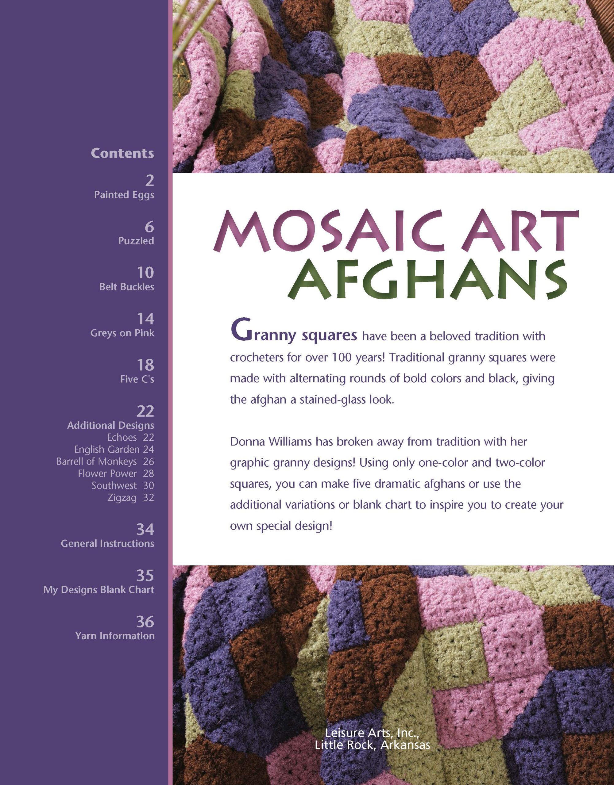 Crochet Mosaic Art Afghans- 5 crocheted afghans made of graphic granny squares make a dramatic break from tradition. Designs include painted eggs, puzzled, belt buckles, greys on pink, and five C’s. All are easy skill level, use size 4 medium weight yarn, and a crochet hook in a US size G-6. Charted variations of the designs are called echoes, English garden, barrel of monkeys, flower power, southwest, and zigzag. Includes a blank grid for charting additional variations, step-by-step instructions for each pattern and full color photos of additional color variations. 36 pages in a softcover.