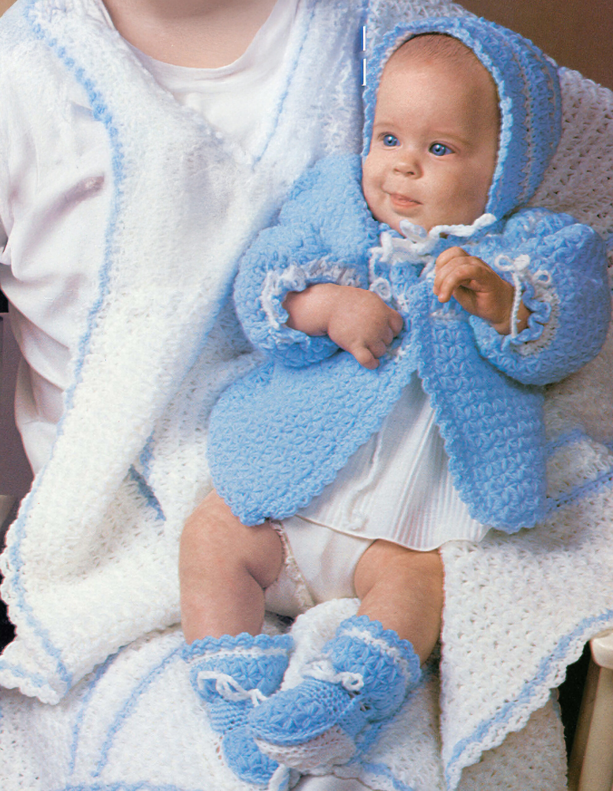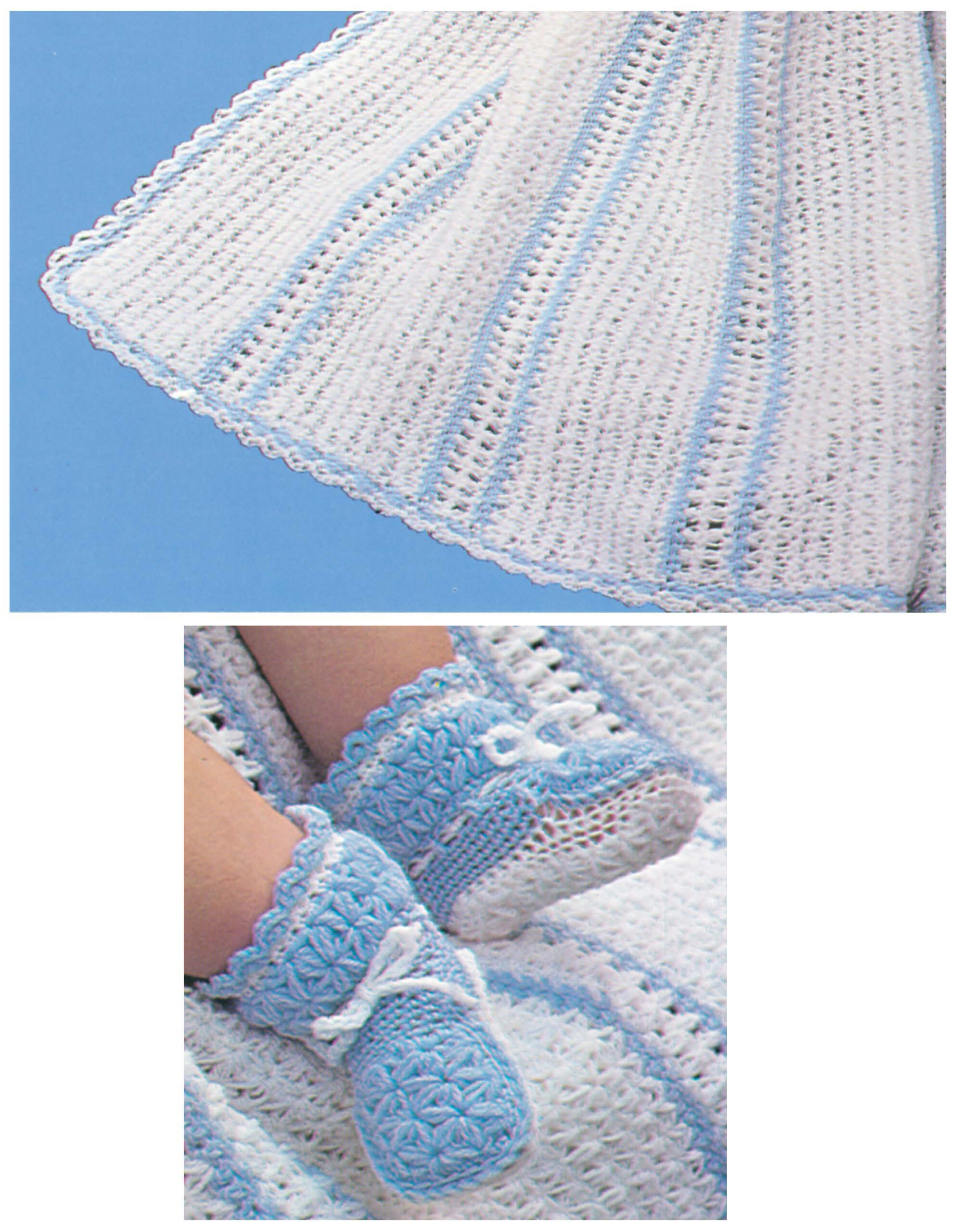 Crochet Snowflake Layette- Create coordinating jacket, hat, booties, and afghan for babies up to 12 months old. Includes detailed instructions and diagrams for reproducing snowflake stitches and cross stitches in crochet. Use size 2 fine weight yarn and US size E crochet hook. Finished carriage blanket measures approximately 29 1/2″x 34″. 8 pages, in a softcover.