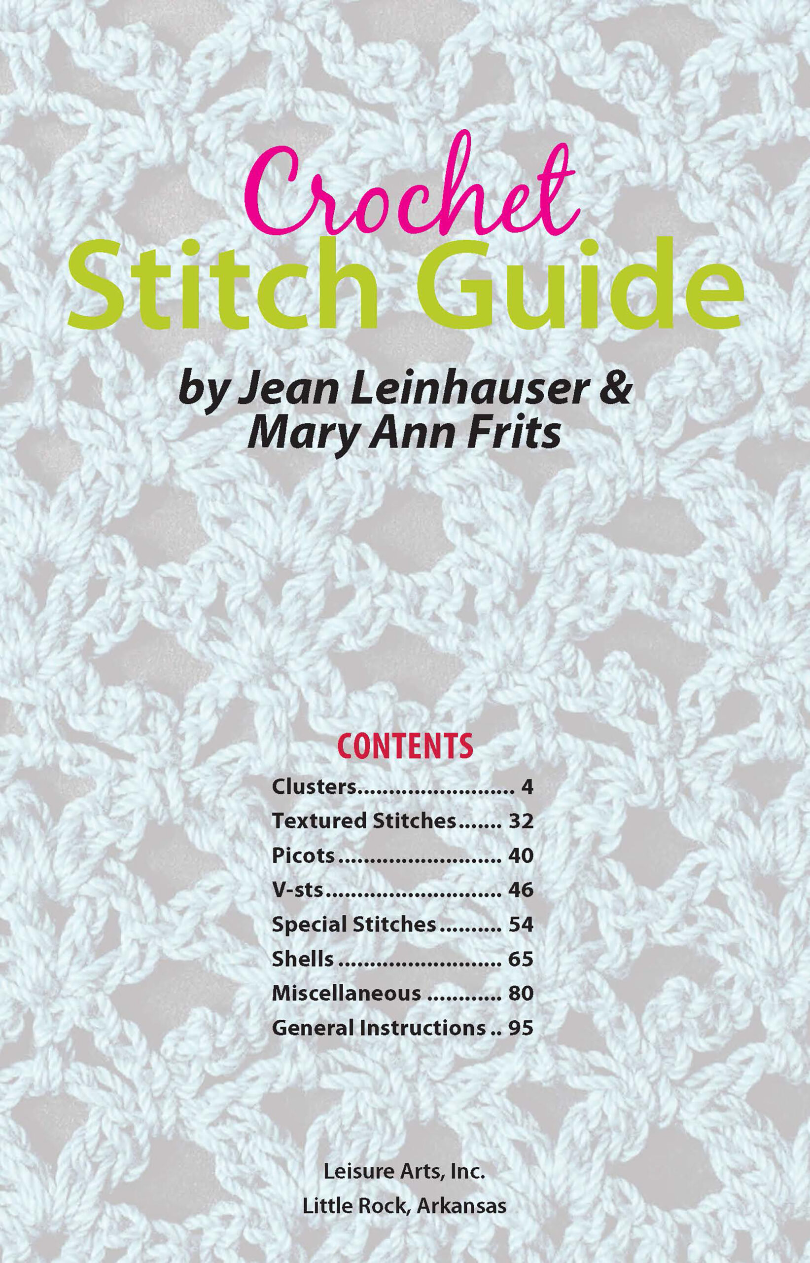 Crochet Stitch Guide- A comprehensive stitch sample guide that is easy to carry along in the project bag. Includes a wide variety of interesting stitches for all skill levels, from beginner to advanced. Contains 86 stitch patterns, in 7 categories: clusters, textured stitches, picots, v-stitches, special stitches, shells, and miscellaneous. Plus a go-to guide for abbreviations and crochet terminology. Designs include: cluster crosses, butterflies, ridged chevron, picket posts, popcorn delight, v-stitches, Spanish fans, switches posts, patches and more. 96 pages, softcover pocket size.