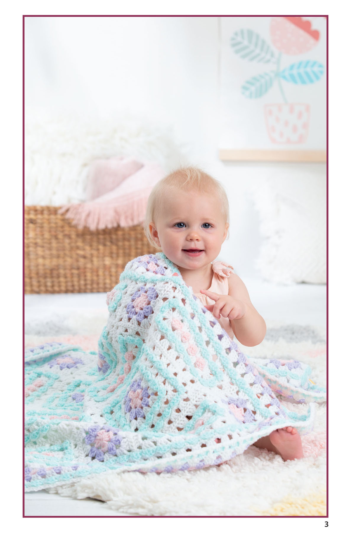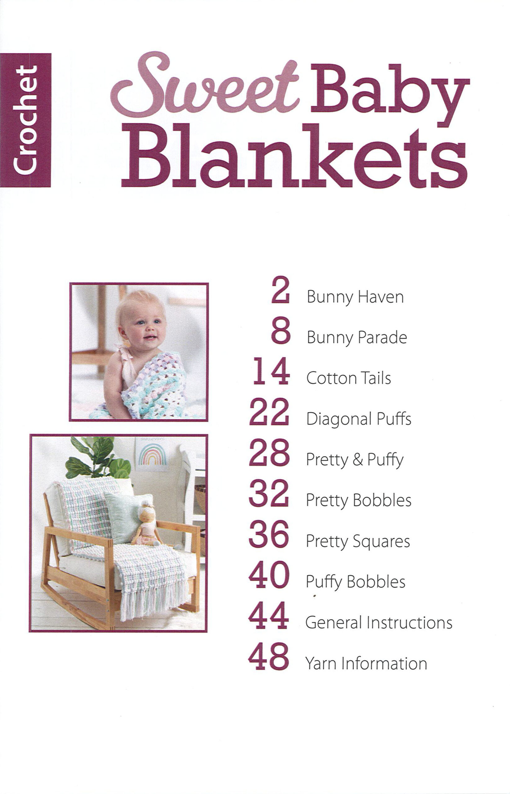 Crochet Sweet Baby Blankets- This sweet collection of warm, cozy, blankets for baby is sure to please. Create beautiful gifts that can be cherished for a life-time from these 8 whimsical and cute patterns. Designs include: bunny haven, bunny parade, cotton tails, diagonal puffs, pretty & puffy, pretty bobbles, pretty squares and puffy bobbles; made using a variety of crochet techniques, like cluster and bobble stitches, for unique looks. Includes step-by-step instructions for each project, information on each stitch used and an additional crochet guide. Projects require US size 3 light weight yarn in a variety of colors and a crochet hook in size H-8 or G-6; 4 or 5 millimeter hooks. Finished project sizes range from approximately 31 1/2″x 42″ and 37 1/2″x 49″. Beginner friendly, easy skill level projects. 48 pages, softcover.