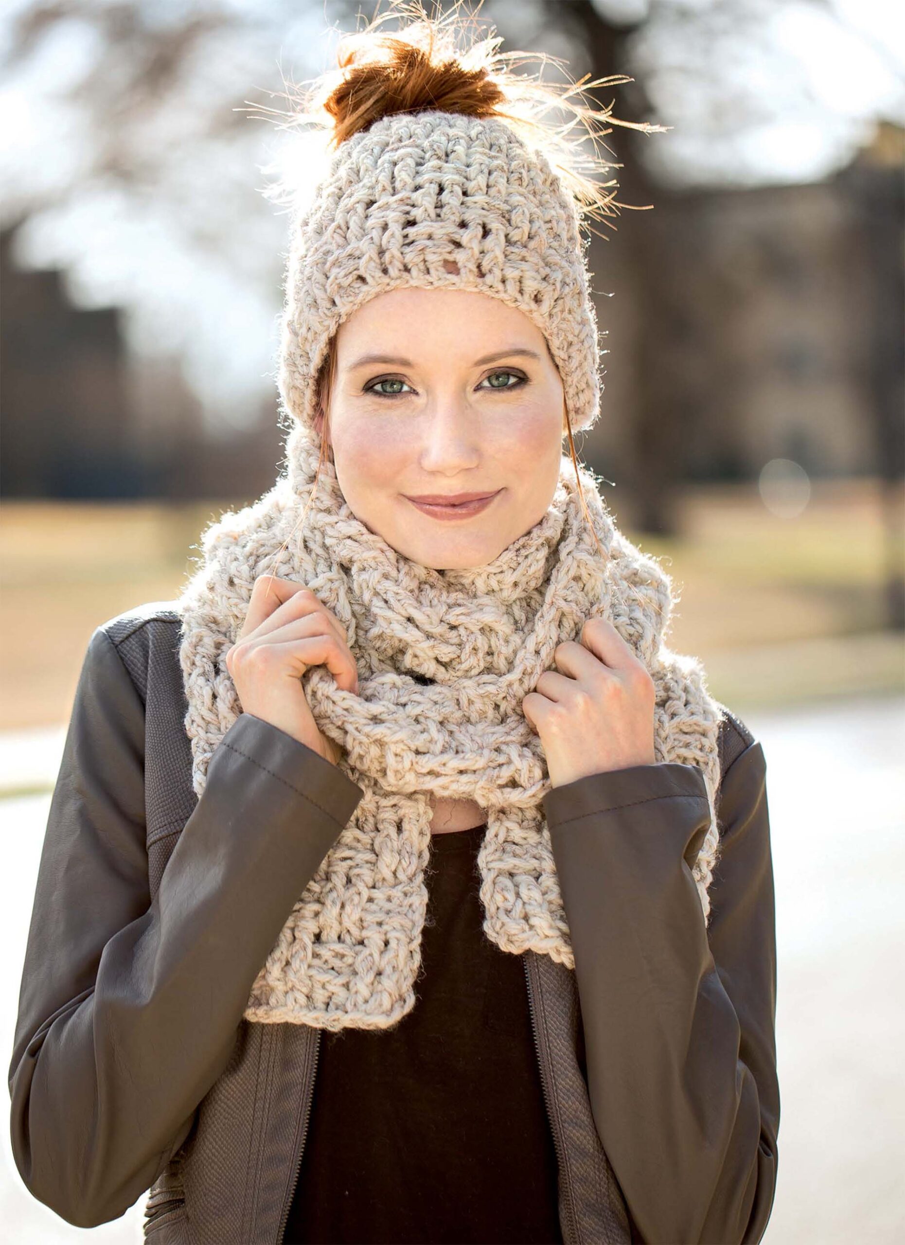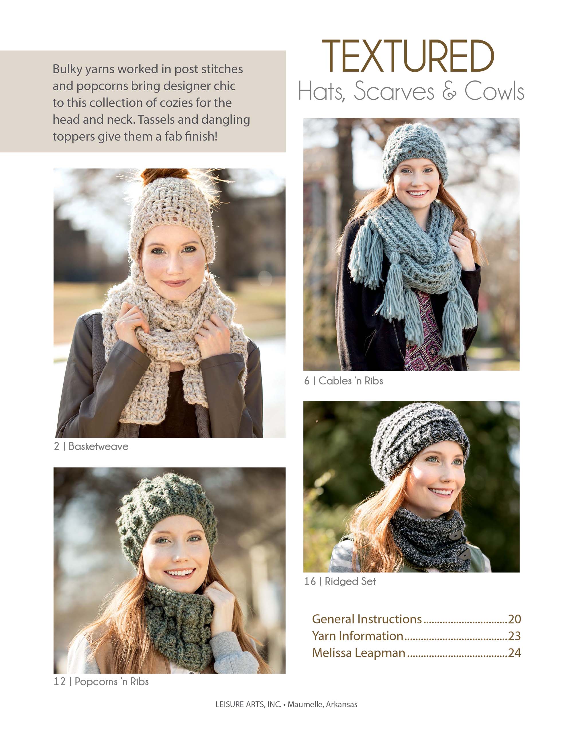 Textured Hats, Scarves & Cowls Crochet- US size 5 bulky weight yarns worked in post stitches and popcorns bring designer chic to 4 cozy crochet sets. Designs include: basketweave, cables and ribs, popcorns and ribs, and ridges, with each having some combination of a hat, scarf or cowl and headband. All patterns are quick and easy to crochet and are rated an easy or easy+ skill level. Includes row by row project instructions for each piece. Finish hat project sizes range between 18 3/4″ and 21″ in circumference. 24 pages, soft cover.