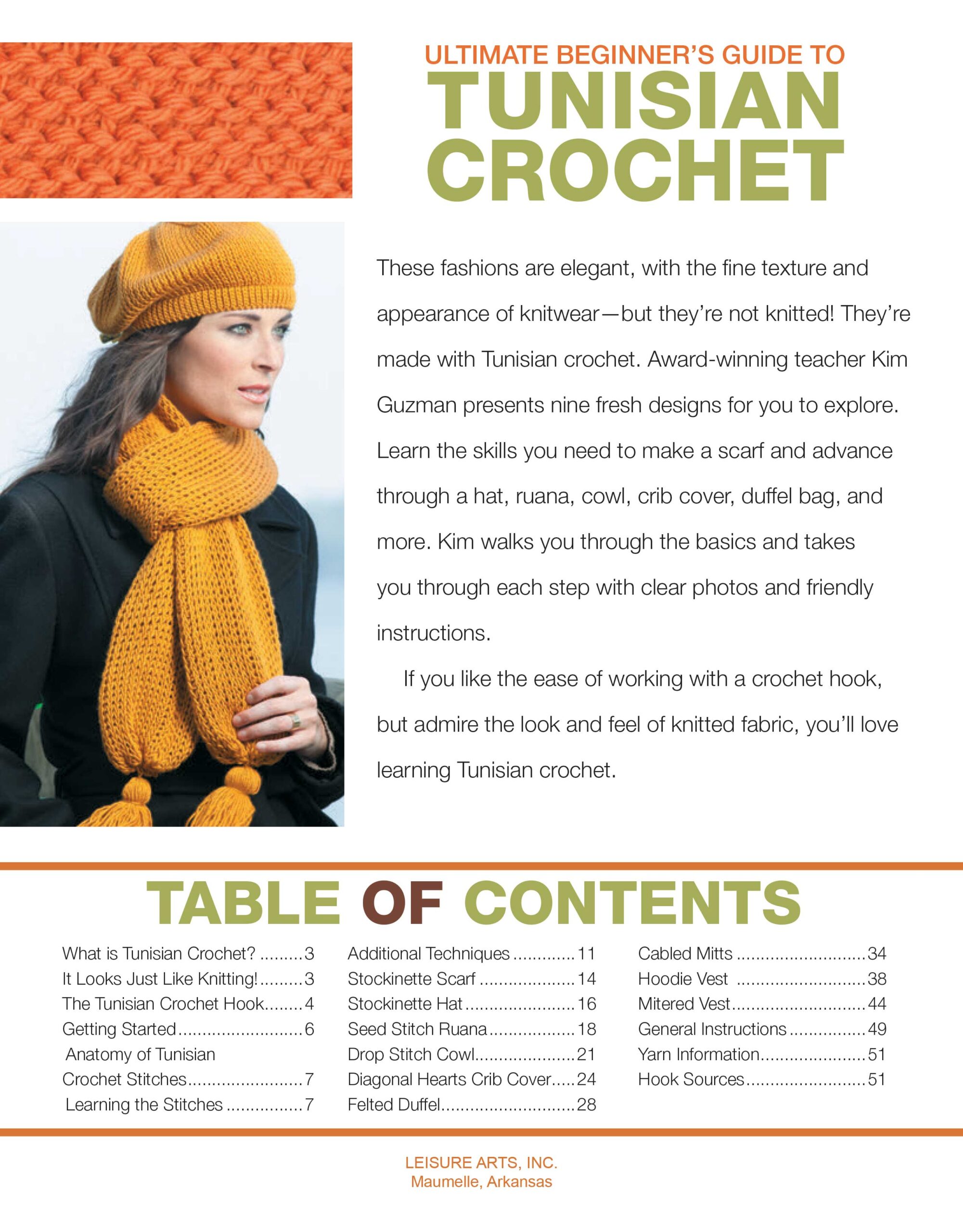 Crochet Ultimate Beginners Guide To Tunisian Crochet- Included is a comprehensive guide to Tunisian crochet stitch patterns, tools and techniques with clear photos and detailed instructions. Nine fresh projects for you to explore will help you develop the skills you need, perfect for beginners. Designs call for yarn ranging between US sizes 2 fine to 4 medium weight. Projects include stockinette scarf and hat, seed stitch ruana, drop stitch cowl, diagonal hearts crib cover, felted duffel, cabled mitts, hoodie vest and mitered vest. All projects are one size fits most except for the hoodie and mitered vests, which include sizing from extra small to extra large; finished sizes measuring between approximately 31.5″ and 46.5″ around the chest. Recommended hook sizes range between US size J-10 and L-11 with lengths between 10″ and 22″; 6 to 8 millimeter hooks measuring 25 to 56 centimeters in length. 52 pages, softcover.
