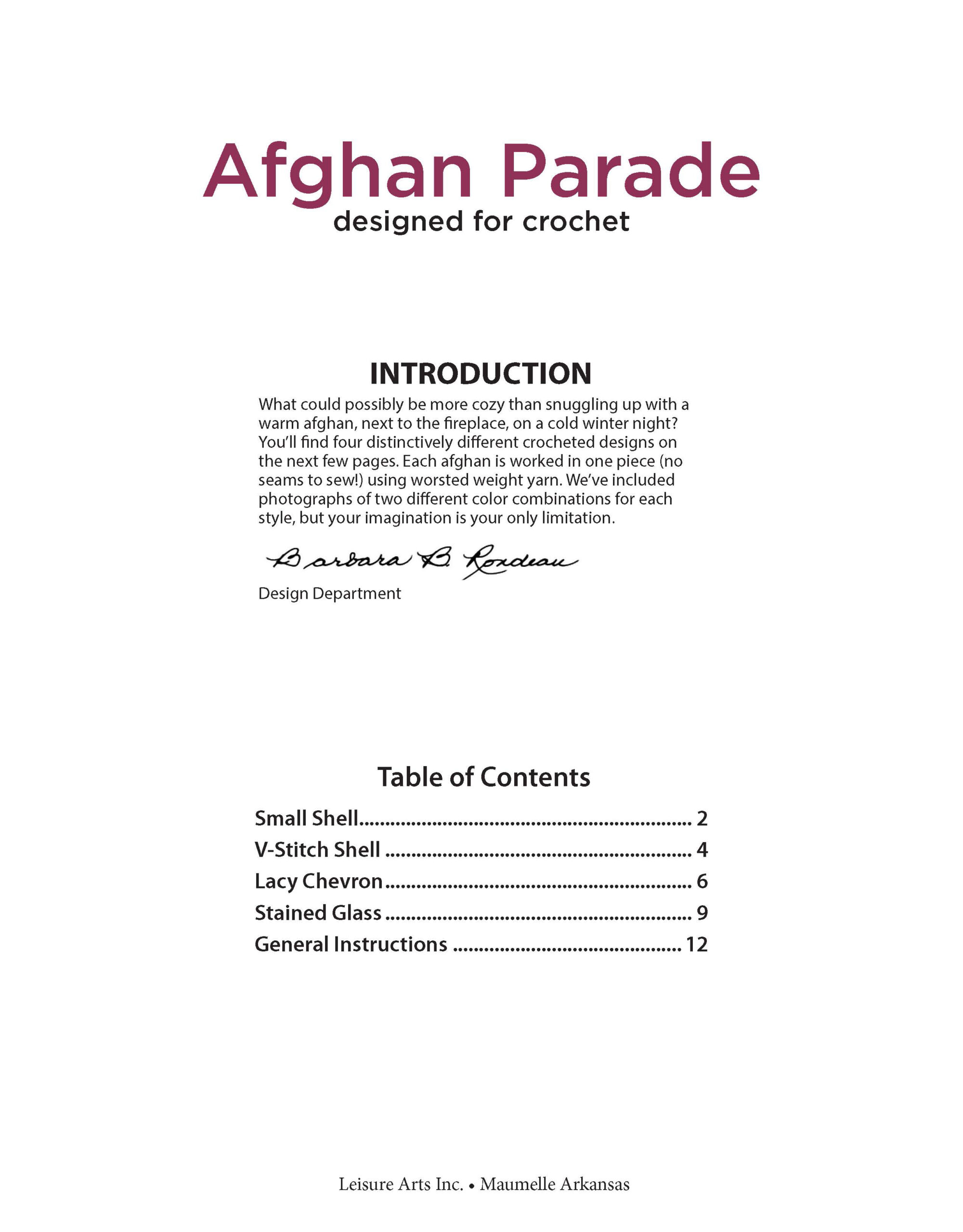 Crochets Afghan Parade- What could possibly be more cozy than snuggling up with a warm afghan on a cold winter night? Keep your family warm and cozy with these 4 afghan designs. With two color recommendations per design, you can fully personalize your afghan to fit your home decor theme. Designs include: small shell, v-stitch shell, lacy chevron, and stained glass. Each project can be made using size 4 worsted weight yarn and US size H-8, 5 millimeter, or J-10, 6 millimeter, crochet hooks. Includes step-by-step instructions for each design, general instructions and illustrated stitch diagrams. Finished afghans measure between approximately 48″x 70″ and 50″x 73″. Easy level. 12 pages, softcover.